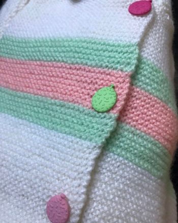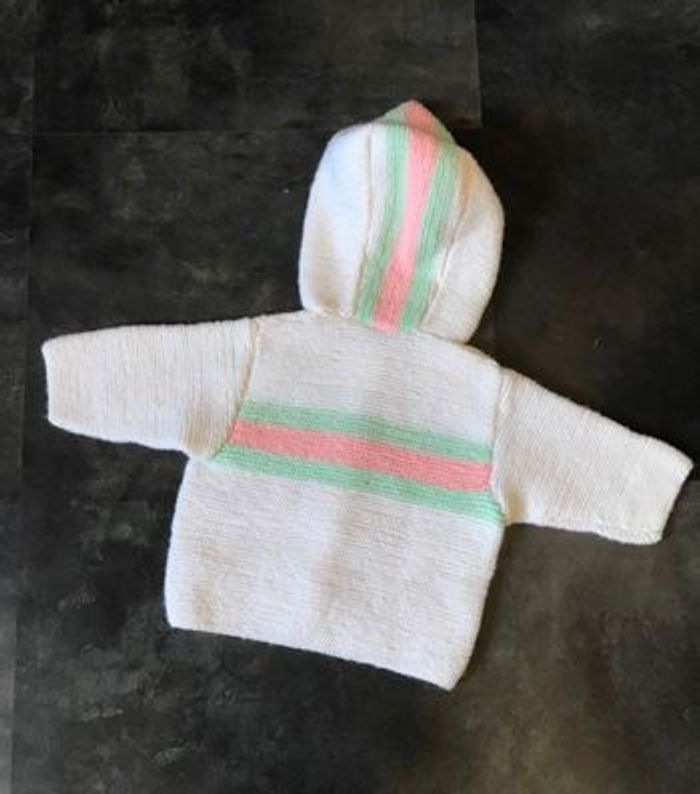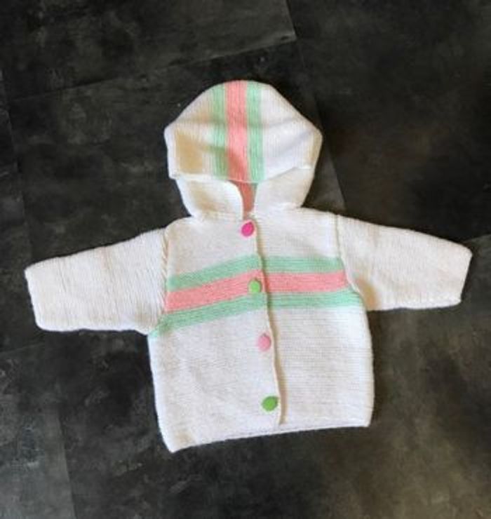 gilet à capuche fait main au point mousse Taille 3 mois Tons blanc cassé, rayures vert et rose Boutons fantaisies
