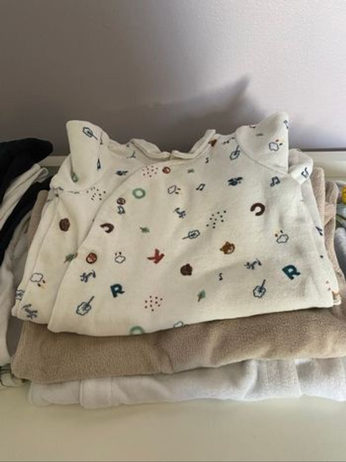 6 pyjamas coton 3 pyjamas velours 4 body ML 3 body MC 3 body SM 3 tee shirt MC 1 tee shirt ML 1 sweat 3 bas de survêtement 2 pantalons 2 salopettes 1 gilet Pas de taches Pas de déchirures Vêtements très très peu portés Vends lot complet de marques différentes