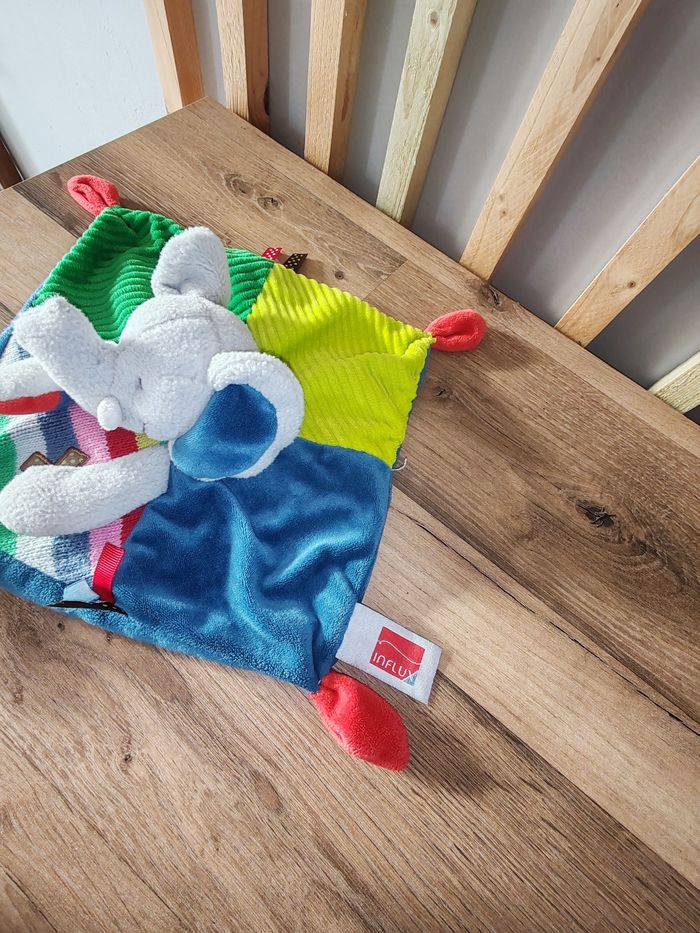 Doudou plat éléphant gris bleu vert rouge étiquettes INFLUX Tbe Étiquette marque présente 9.90 euros Envoie en relais