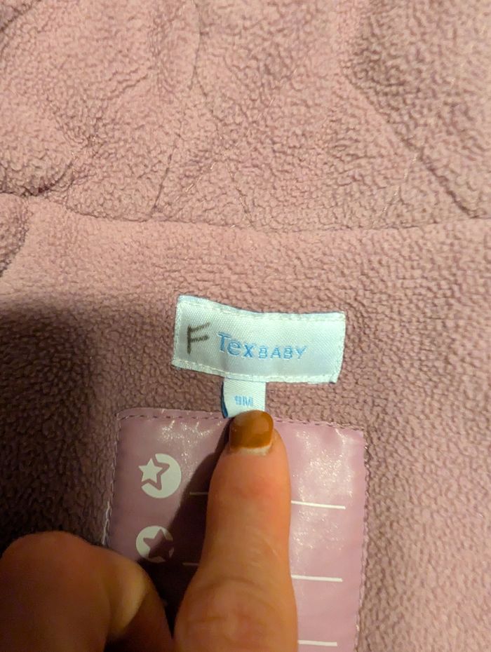 Manteau type duffle-coat mauve, taille 9 mois, en très bon état. Marque Tex baby.