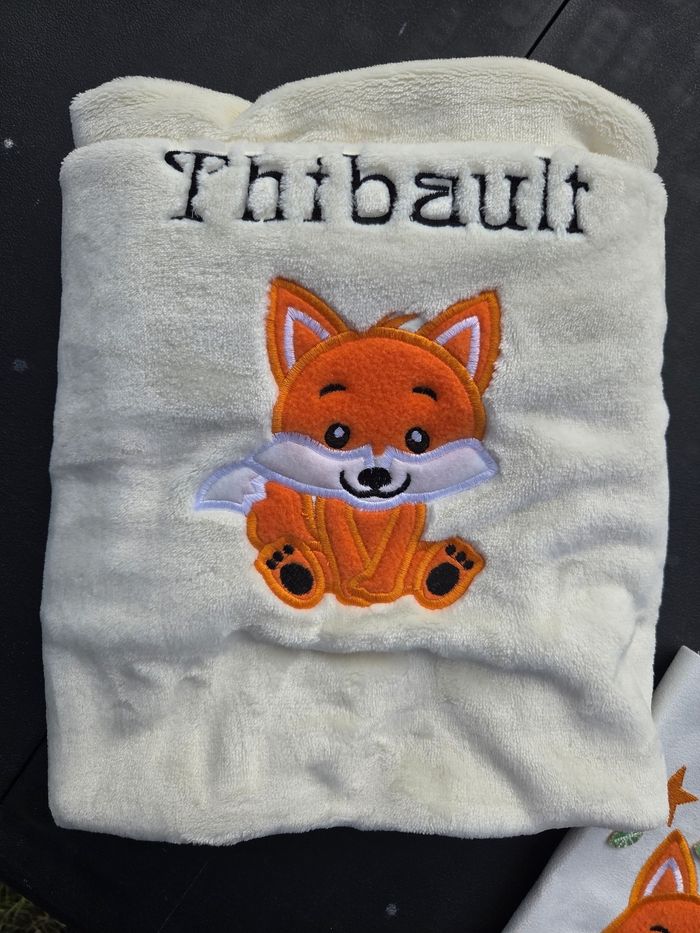 Bonjour Je vends ce lot d'ensemble de naissance Au nom de Thibault brodé -1 plaid extrement doux -1 bavoir -1 protege carnet de santé Neuf N'hésitez pas à faire un lot dans mon dressing Cordialement