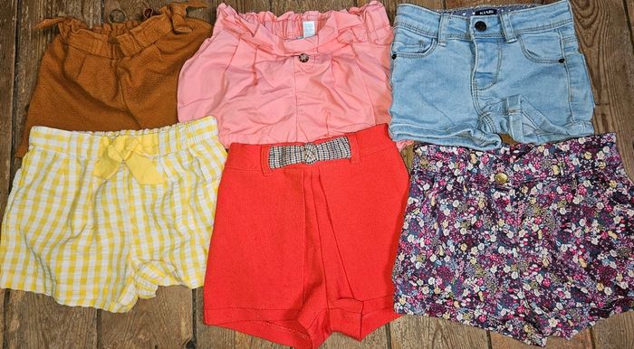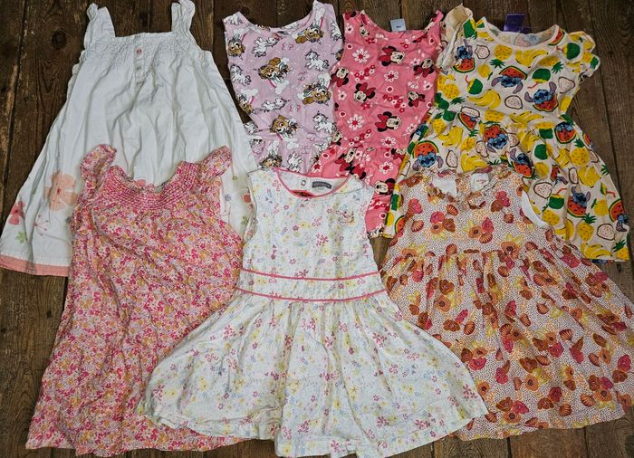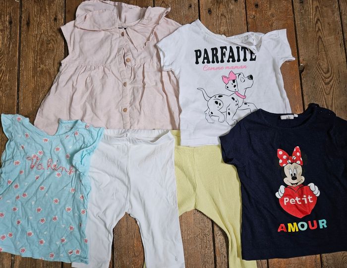 Lot de 19 vetements été, comprenant : - 7 robes - 6 shorts - 3 t-shirt - Un chemisier - 2 leggings court Le tout en bon état sauf un trou sur une robe (voir photos) mais ne se voit pas quand le robe est portée. Différentes marques telles que disney, obaibi, sergent major, Tape a l'oeil, creeks, gemo et kiabi Taille 24 mois