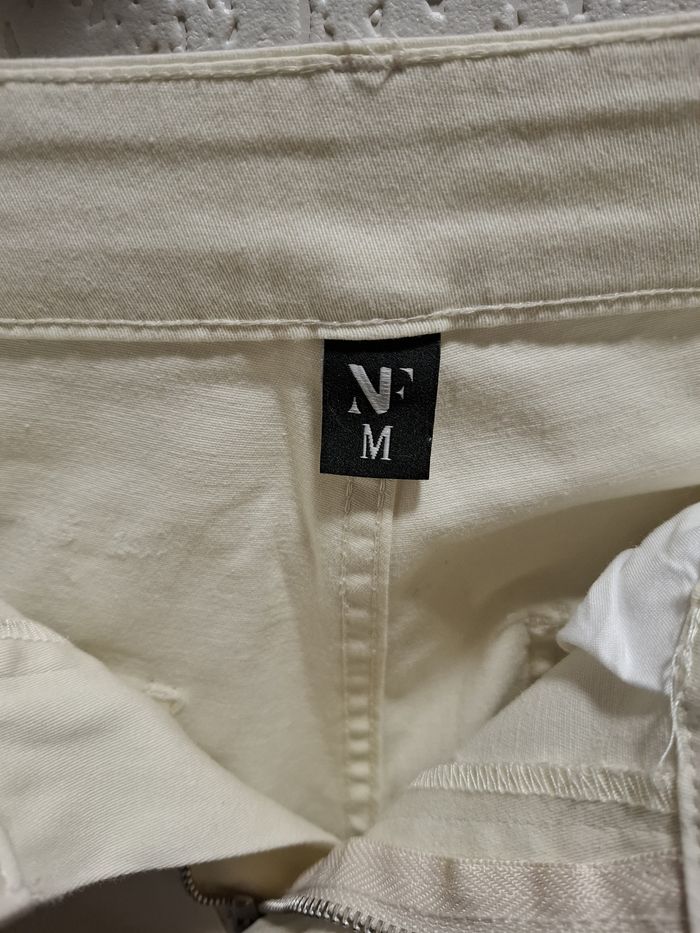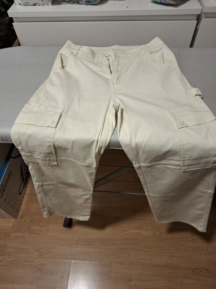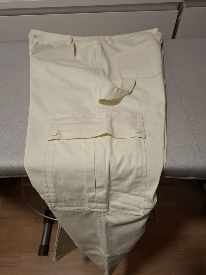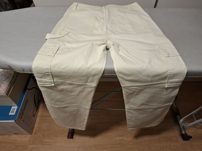 Beau pantalon baggy pour femme, marque NVFelix, en taille M (38), couleur crème, fermeture bouton crème + zip, 2 grandes poches devant +2 grandes poches à rabats jambes, 2 poches à l'arrière, bas droits, en 97 % coton et 3 % elasthane, lavable en machine à 40° et en très bon état (très peu porté). (micro tâche en bas de la jambe droite mais vraiment rien de grave, voir dernière photo).