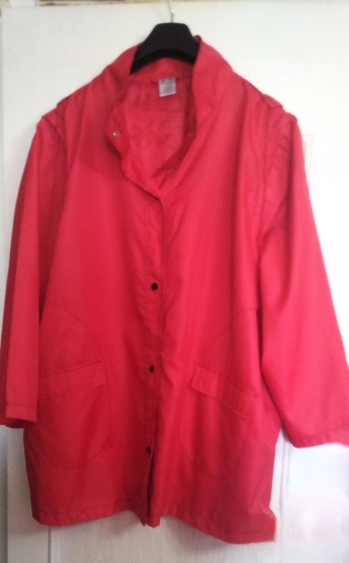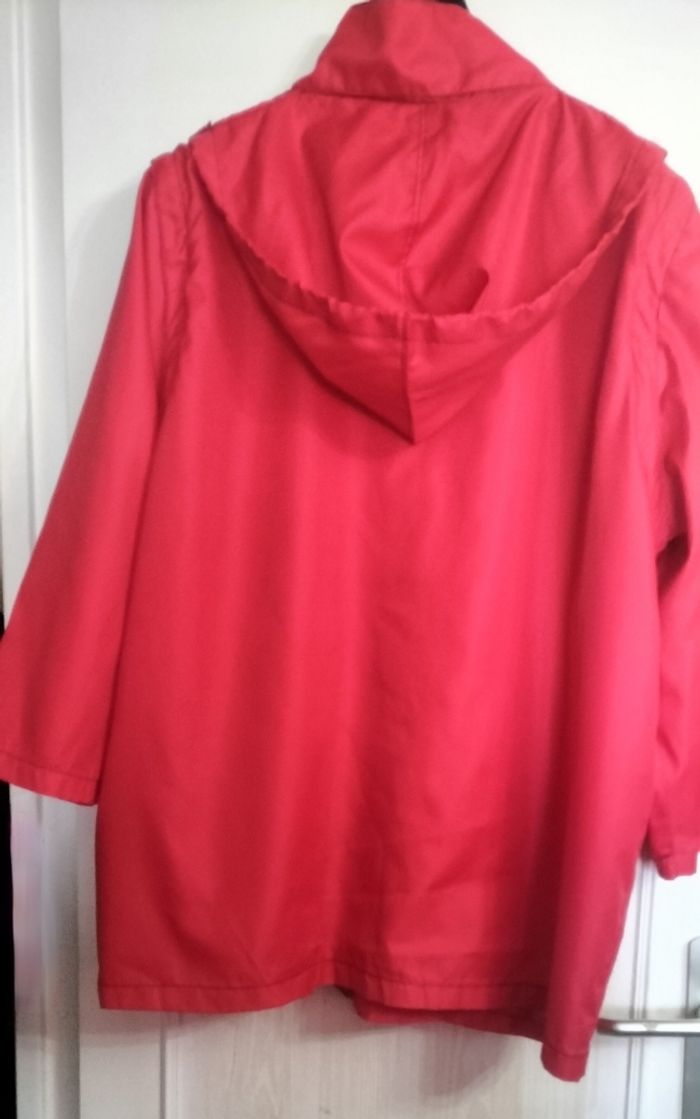 vends veste légère femme de couleur rouge en grande taille. - Type de produit : Veste - Taille : 52 /54- 6XL - Couleur : Rouge - État : Neuf sans étiquette - Fermeture par pression - capuche - les manches peuvent se retirer par " fermeture éclaire " - jamais porter -6€