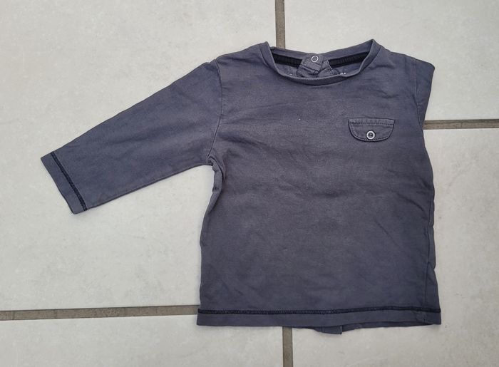 T-shirt manches longues, de couleur gris foncé, avec poche, de la marque Kitchoun, taille 6 mois (67 cm), en très bon état. Article lavé pour la vente.