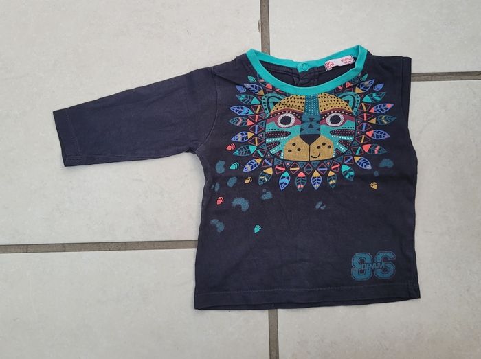 T-shirt manches longues, de couleur noir avec motif coloré, de la marque Du Pareil au Même, taille 6 mois (68 cm), en très bon état. Article lavé pour la vente.