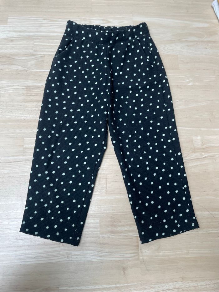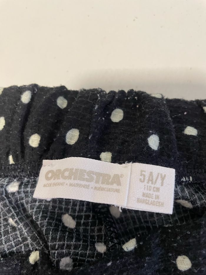 Vends pantalon ample noir à motifs de pois blancs, taille 5 ans, de marque Orchestra, en très bon état.