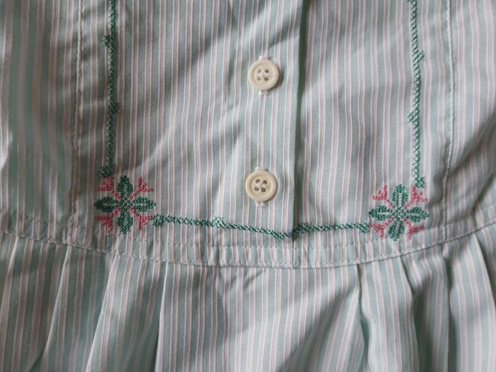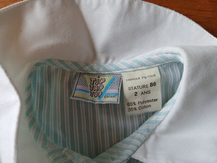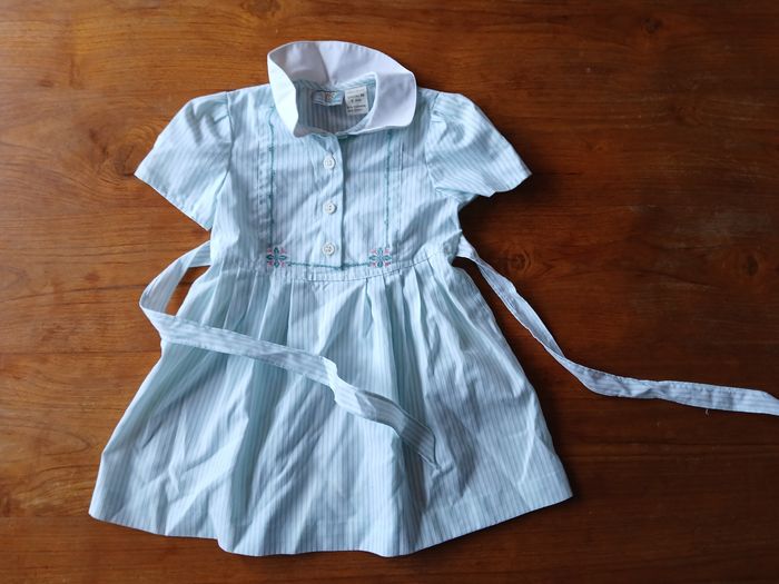 Robe a manches courtes blanches a petites rayures vertes et brodée sur le devant. Ceinture. Taille 2 ans / 86 cm. Marque Tip Tap Top. Bon état