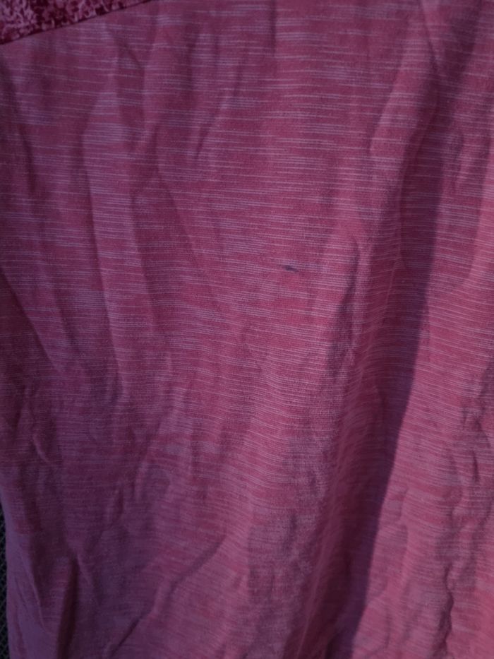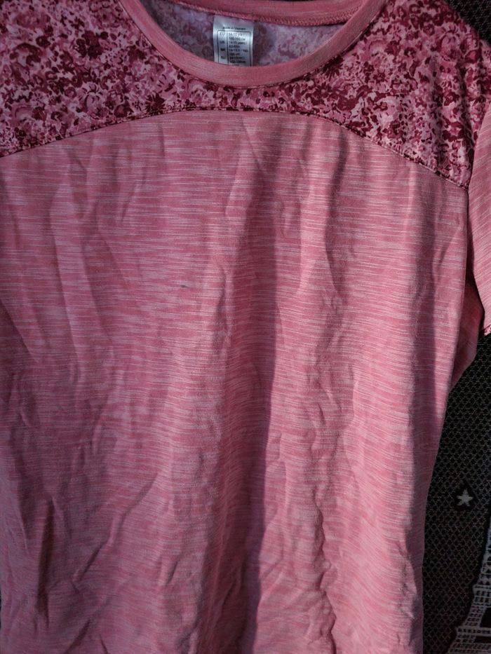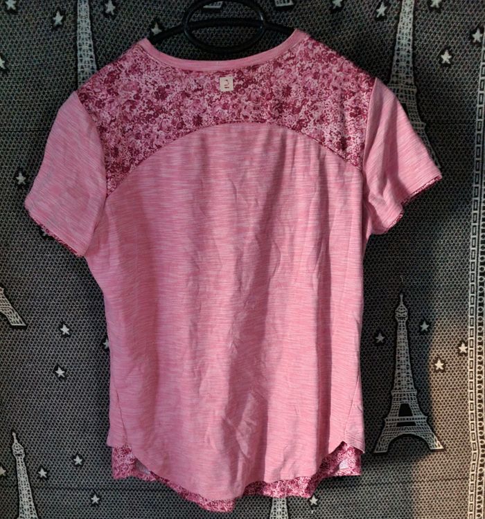 T-shirt de sport rose chiné 2 en 1 constitué de deux épaisseurs : l'une près du corps, légèrement plus longue et peut se glisser dans le short, le pantalon, le legging. L'autre partie reste dehors et habille ,de cette manière, le bas du dos et le ventre restent couverts même pendant une roue,taille 14-15ans marque Domyos, légère tache voir dernière photo.