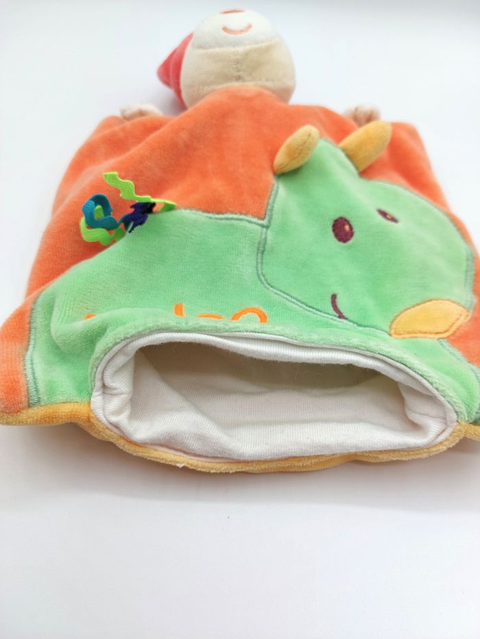 Doudou plat marionnette ours orange jaune bonnet KALOO 1998-2010 dragon vert - photo numéro 4