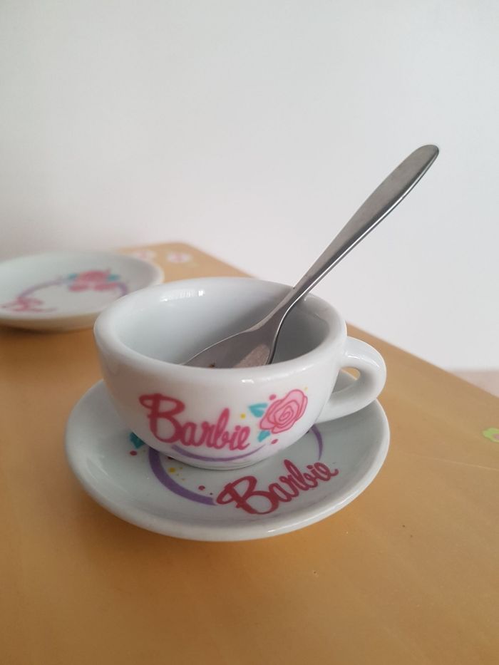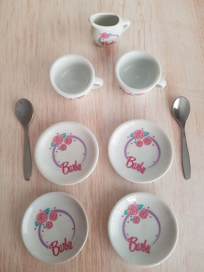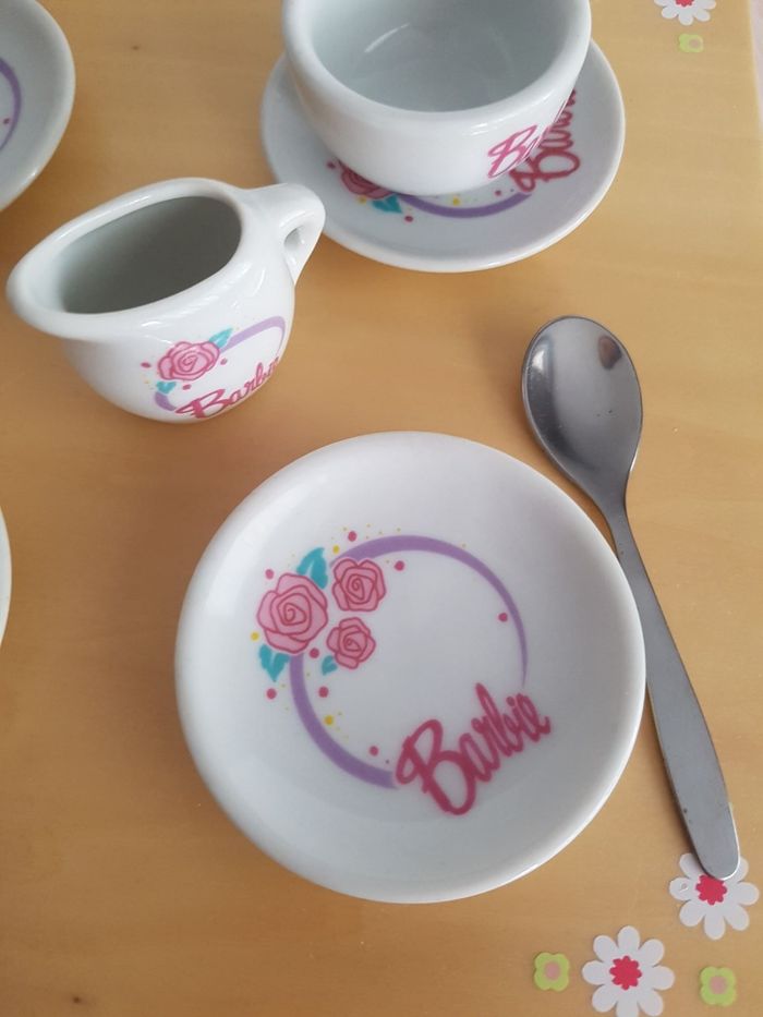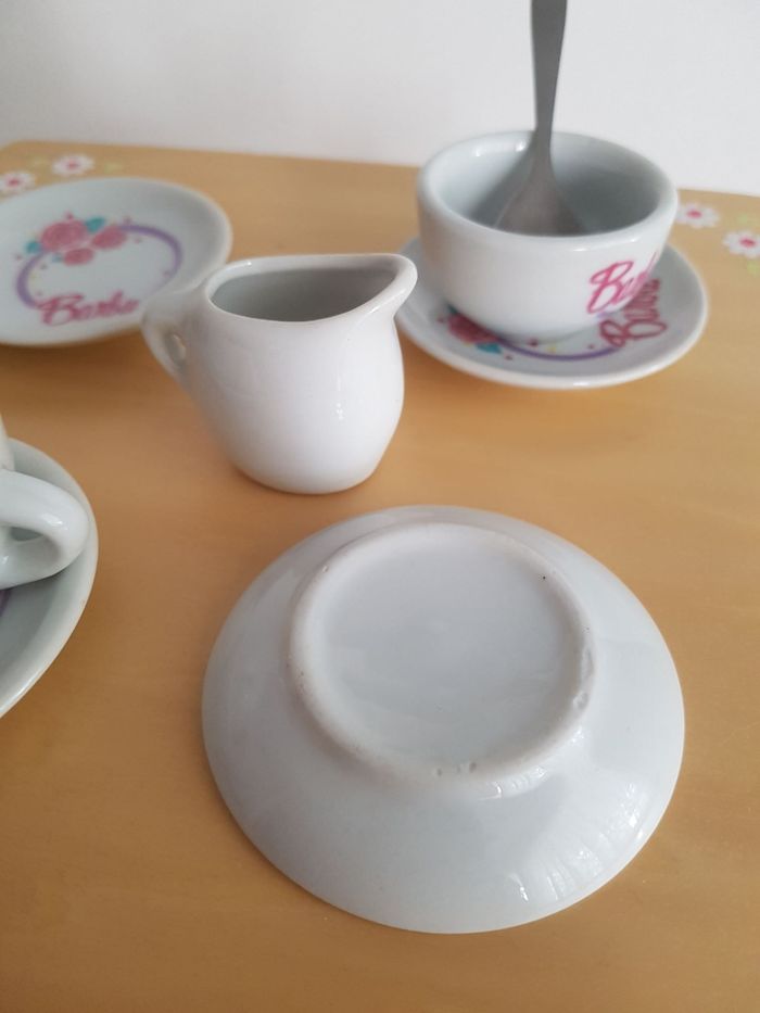 Table de salon de thé (tea party) et lot de dînette en porcelaine pour jouer au restaurant et s'amuser à cuisiner comme les grands. Un jeu d'imitation pour partager, jouer à la marchande, au petit patissier ou dans la cuisine. • table en bois Djeco pour poupée Dimensions : 22 × 22 cm et 12 cm de hauteur • Vaisselle en porcelaine Barbie 4 assiettes, 2 tasses, 1 pichet et 2 cuillères en métal Diamètre des assiettes : 6,5 cm Longueur des cuillères : 8,7 cm