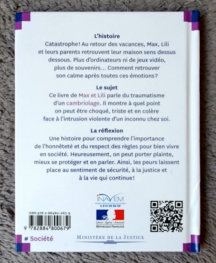 Descriptif : Catastrophe! Au retour des vacances, Max et Lili et leurs parents retrouvent leur maison cambriolée et sens dessus dessous. Ils sont choqués, tristes et en colère : Plus d'ordinateurs, plus de jeux vidéo, plus de souvenirs... Comment retrouver son calme après toutes ces émotions ? Ce livre de Max et Lili parle de la violence d'un cambriolage pour les enfants comme pour les parents, de l'intrusion d'un inconnu chez soi, du vol des objets qu'on aime, de la peur de rester seul... Et de l'importance de l'honnêteté et du respect des règles pour bien vivre en société. Il faut porter plainte, en parler, mieux se protéger pour que les peurs, le stress, la rage laissent place au sentiment de sécurité, à la justice et à la vie qui continue.. Date de parution : Janvier 2005. Auteur : Dominique de Saint Mars. Illustrateur : Serge Bloch. Collection : Ainsi va la Vie! Éditions : Calligram. =) 43 pages. Montant d'achat magasin : 6.20E. État neuf!