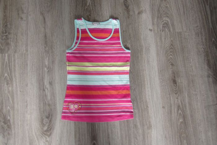 #10Ans_Fille_Nathg2210 DÉBARDEUR ROSE RAYE FILLE "ORCHESTRA" - 10 ANS - n°01 Débardeur rose rayé / bleu / blanc / vert - Motif cœur à paillettes en bas - Col rond - Dimensions épaule à épaule : 21 cm et longueur totale : 46 cm - Matière : 95% coton et 5% élasthanne. Article d’occasion en très bon état - Sans trou - Ni tache - Lavé et repassé pour la vente. Possibilité d'envoyer d'autres photos sur simple demande. Maison non-fumeur - Sans animaux. Réduction lot activée. Allez voir mes autres ventes, je vide les placards. Beaucoup de vêtements de marque et beaucoup de jouets. Remise en mains propres ou possibilité d'envoi au tarif en vigueur à votre charge. Retour Refusé. Pour tout renseignement, n'hésitez pas à me contacter, je répondrai volontiers à vos questions. Réponse Assurée. Pour Consulter mes autres annonces tapez Nathg2210.