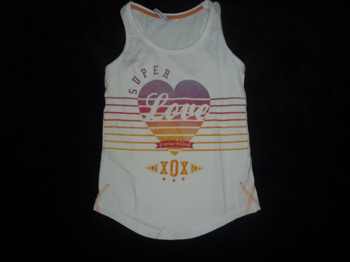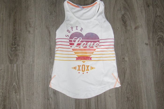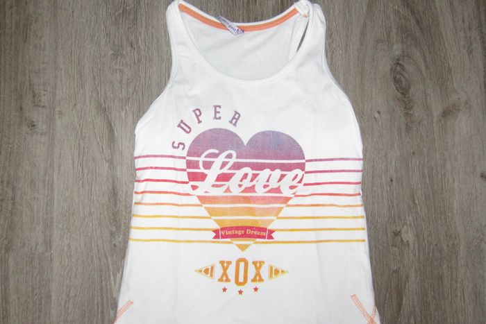 #10Ans_Fille_Nathg2210 DÉBARDEUR BLANC FILLE "GÉMO" - 10 ANS - n°02 Débardeur blanc - Motif et écriture devant - Col rond - Dimensions épaule à épaule : 23 cm et longueur totale : 49 cm - Matière : 95% coton et 5% élasthanne. Article d’occasion en très bon état - Sans trou - Ni tache - Lavé et repassé pour la vente. Possibilité d'envoyer d'autres photos sur simple demande. Maison non-fumeur - Sans animaux. Réduction lot activée. Allez voir mes autres ventes, je vide les placards. Beaucoup de vêtements de marque et beaucoup de jouets. Remise en mains propres ou possibilité d'envoi au tarif en vigueur à votre charge. Retour Refusé. Pour tout renseignement, n'hésitez pas à me contacter, je répondrai volontiers à vos questions. Réponse Assurée. Pour Consulter mes autres annonces tapez Nathg2210.