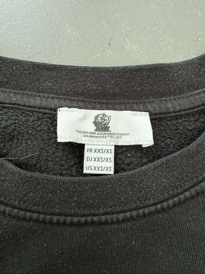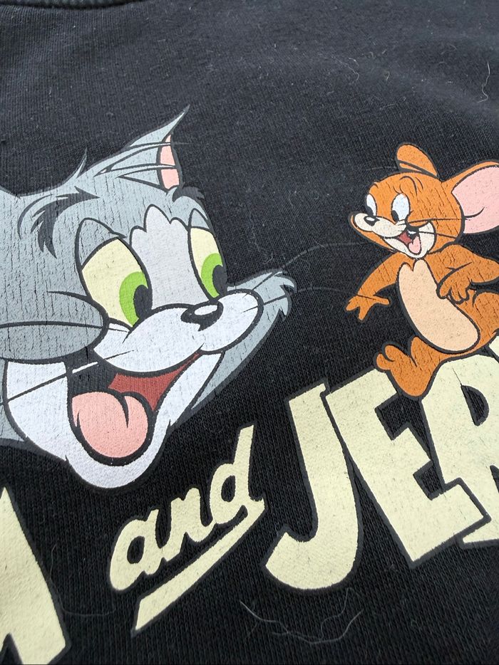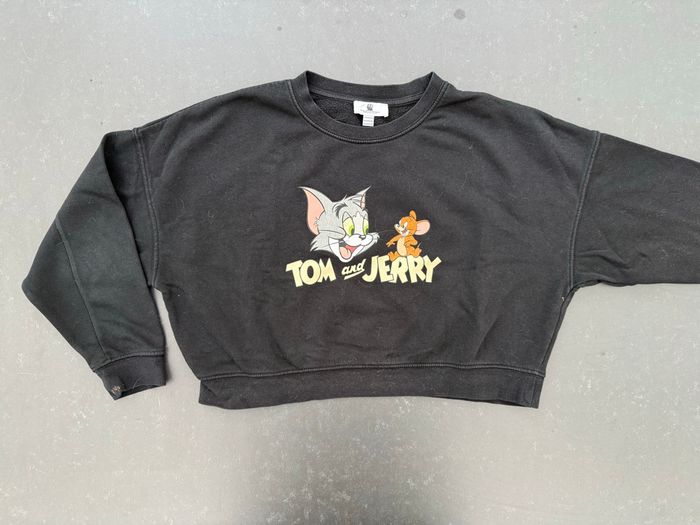 Sweat-shirt court de couleur noir, motif « Tom & Jerry » sur le devant. En très bon état mais le motif est légèrement craquelé et des tâches tenaces sur un bas de manche. En polyester et coton. Taille 12-14 ans, marque Jennyfer. Envoi rapide et soigné, réduction automatique dès 2 articles sélectionnés. Mes autres ventes ici: #12ansfilleugolola #sweat12ansfille