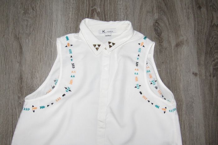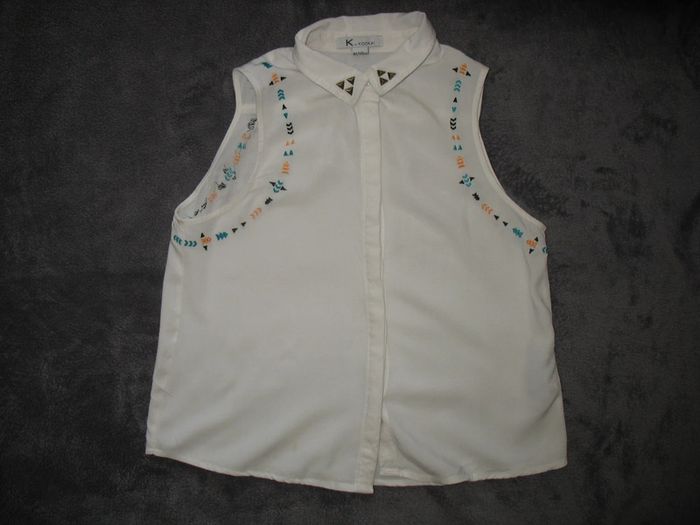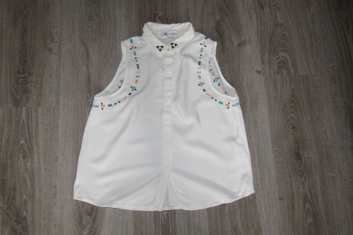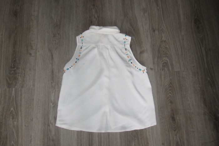 Chemiser sans manche écru avec col - Fermeture par boutons cachés sous la bande - Petits motifs brodés - Dimensions épaule à épaule : 28 cm et longueur totale : 50 cm - Matière : 100% viscose.