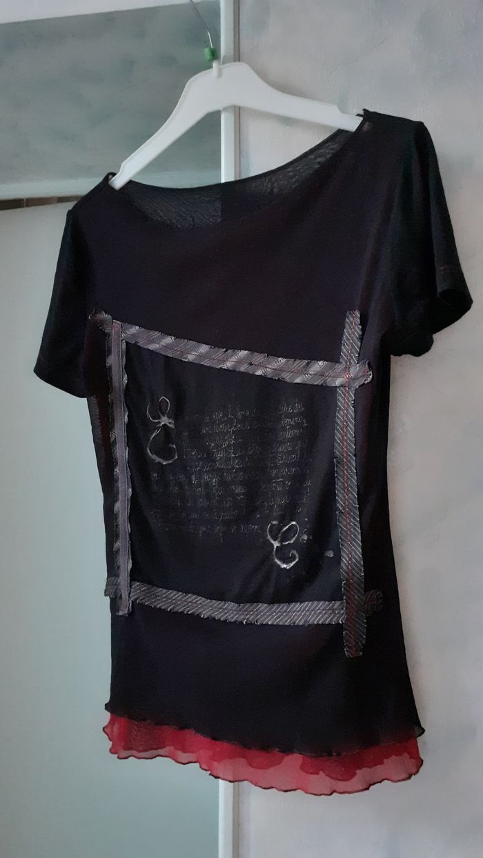 Vends une tunique manches courtes, en voile, doublée devant, en polyester, couleur noir avec du rouge à la base, taille 36. Longueur de l'épaule à la base : 57 cm Largeur aisselle à aisselle : 41 cm.