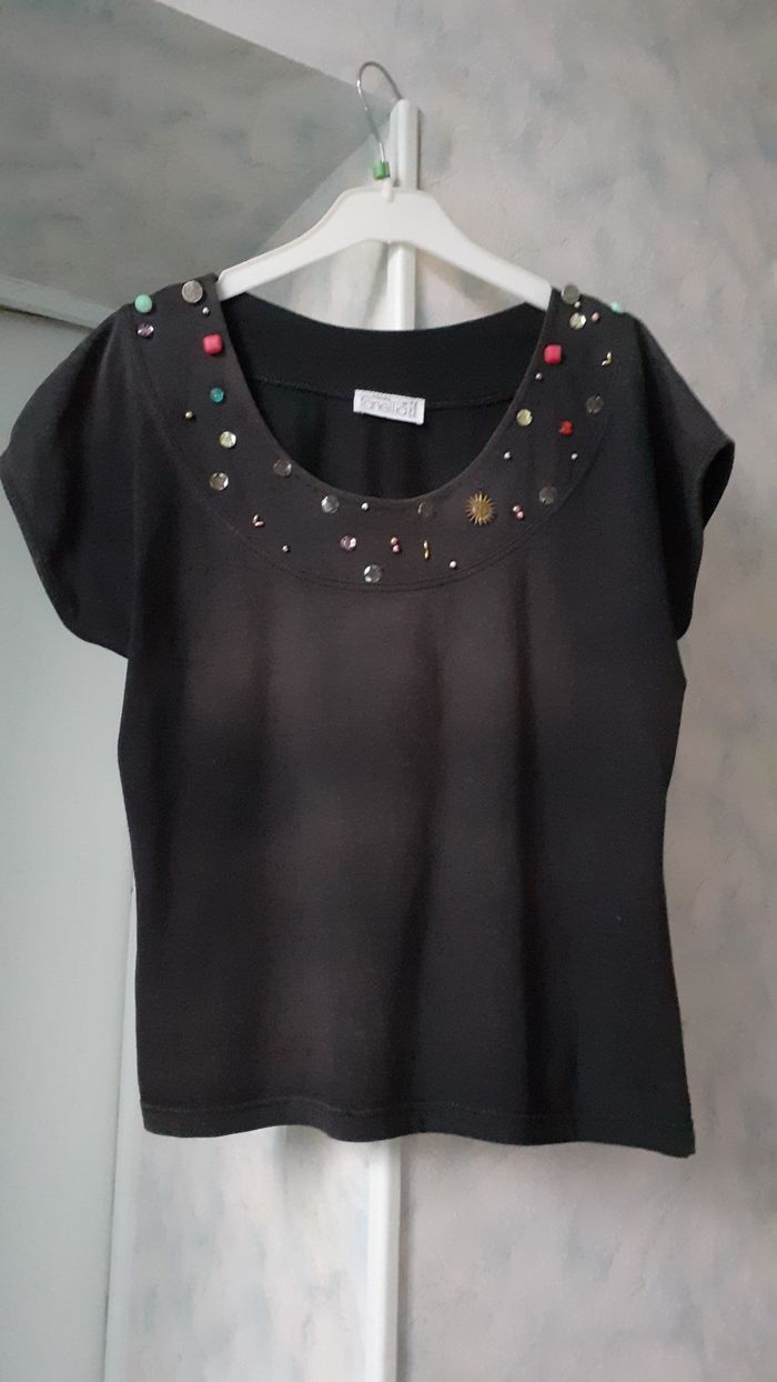 Vends un tee-shirt manches courtes, encolure arrondie ornée de perles et boutons multicolores, couleur noir, marque Fanellia, taille 42. A noter : la couleur noire est un peu fanée. Longueur de l'épaule à la base : 57 cm Largeur aisselle à aisselle : 47 cm.