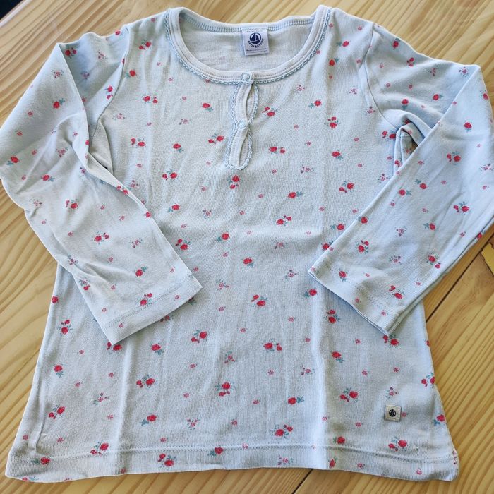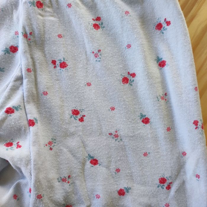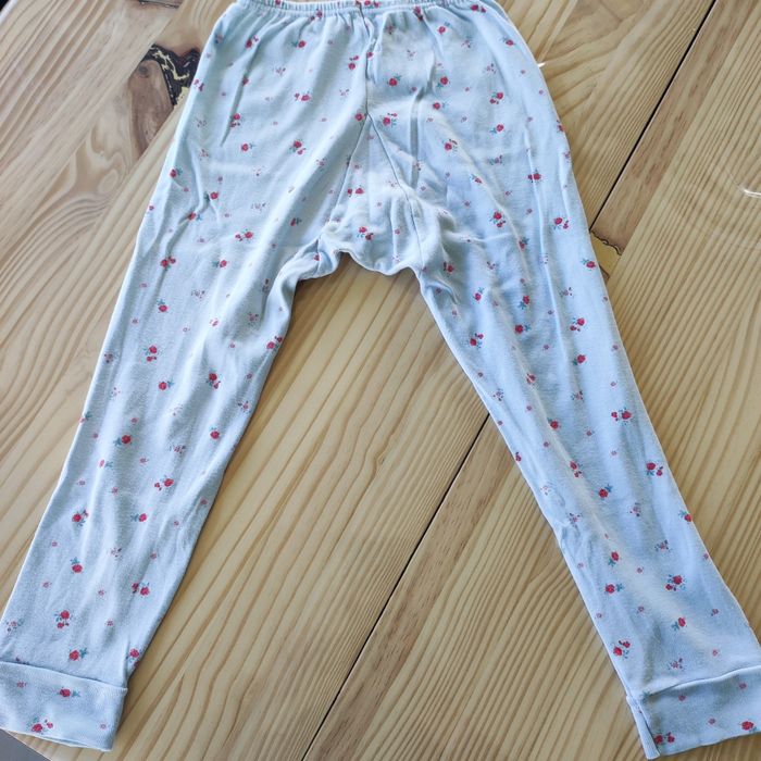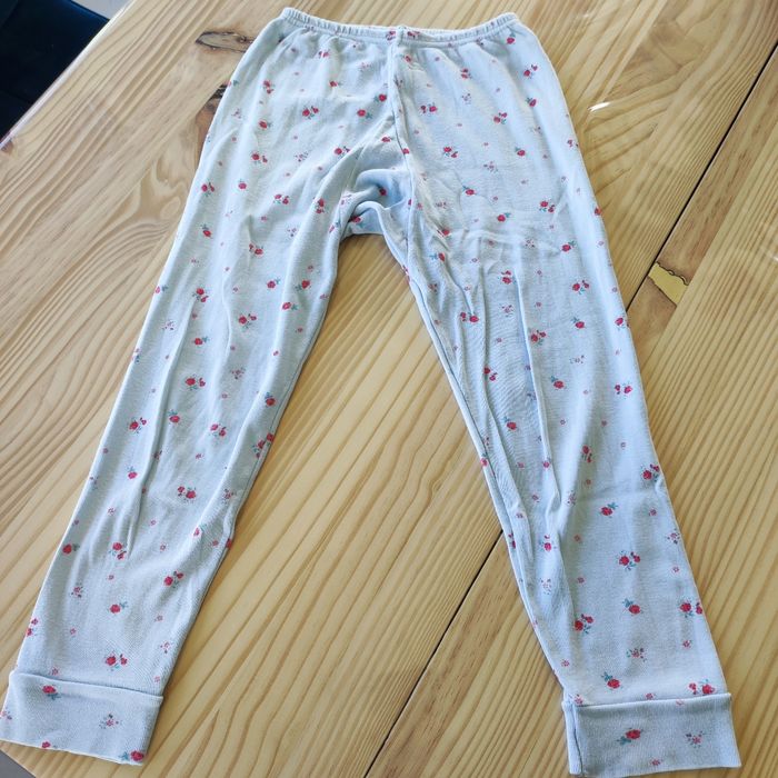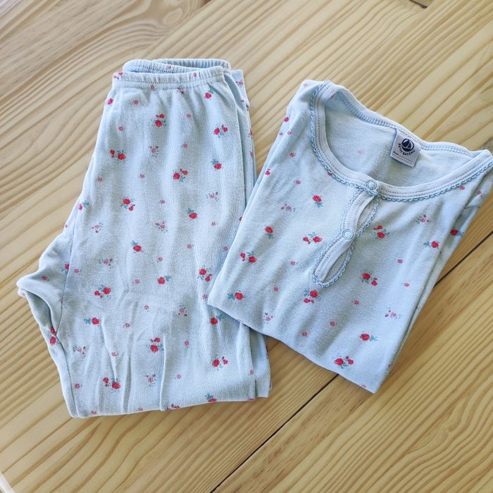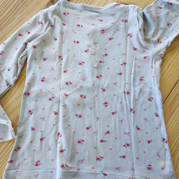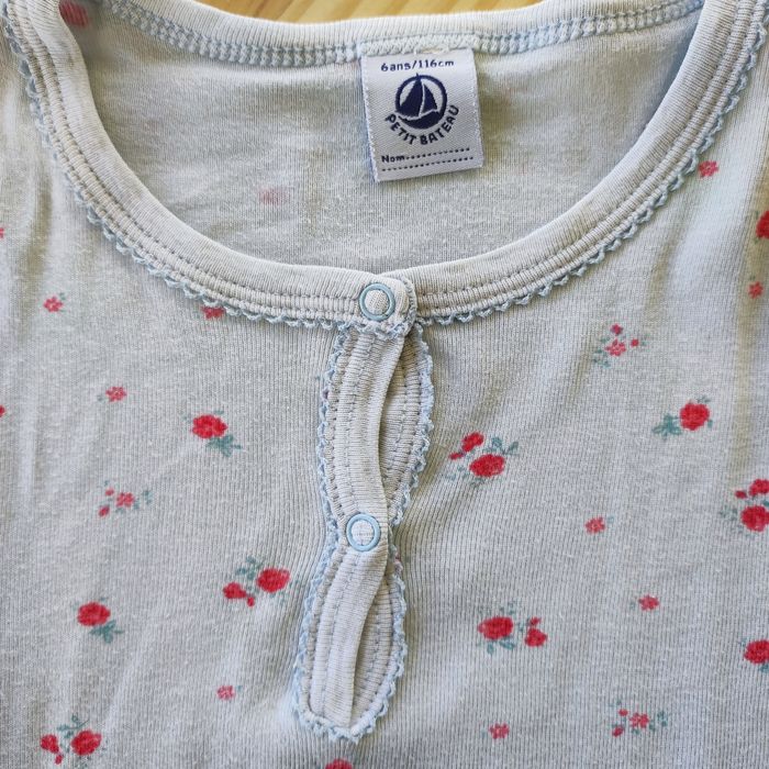 Pyjama fille 2 pièces taille 6 ans marque Petit bateau couleur bleu ciel motif à fleurs rouges bien porter couleur un peu délavé et légèrement boule chez voir photos sinon pas de trou ni de tâche