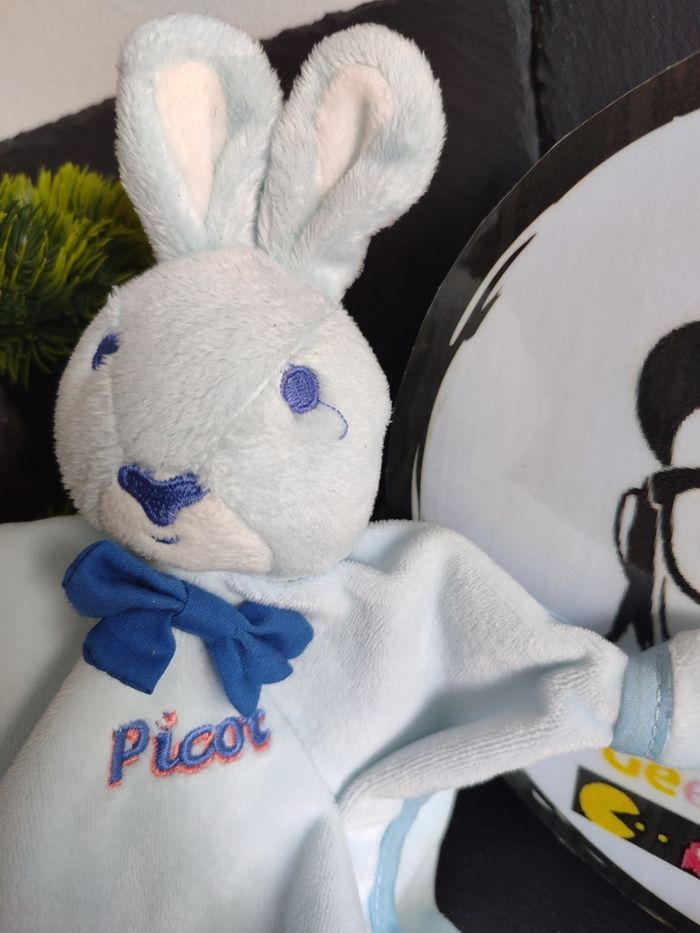 doudou plat picot lapin bleu clair noeud papillon blanc violet rose DD003487 - photo numéro 1
