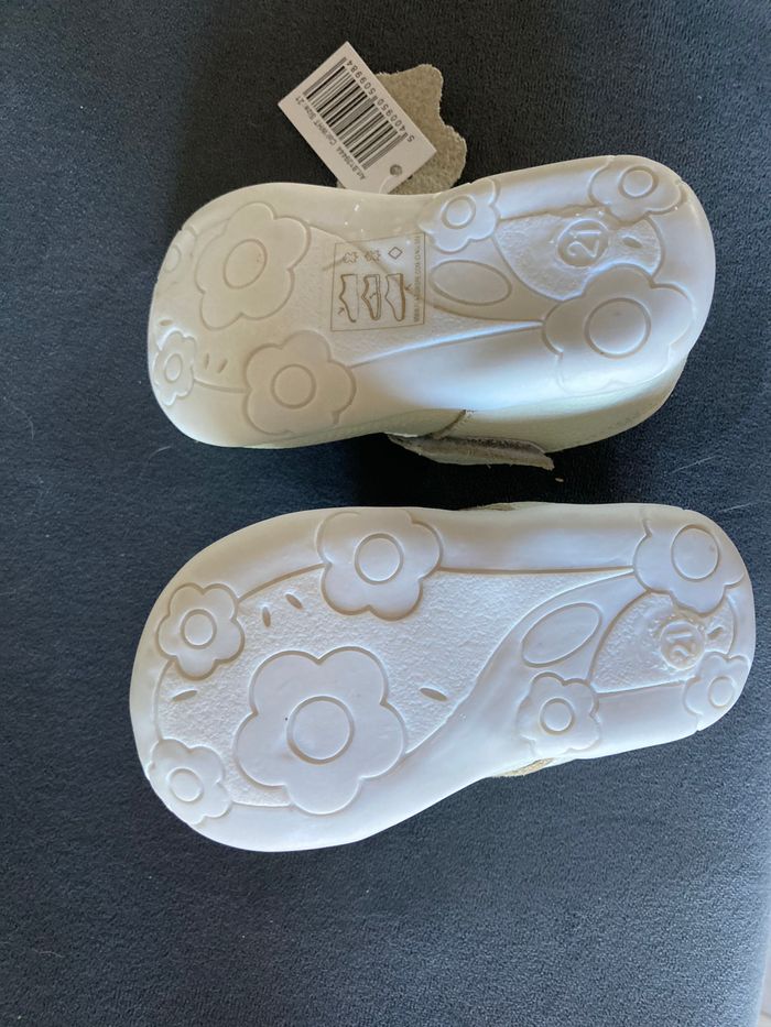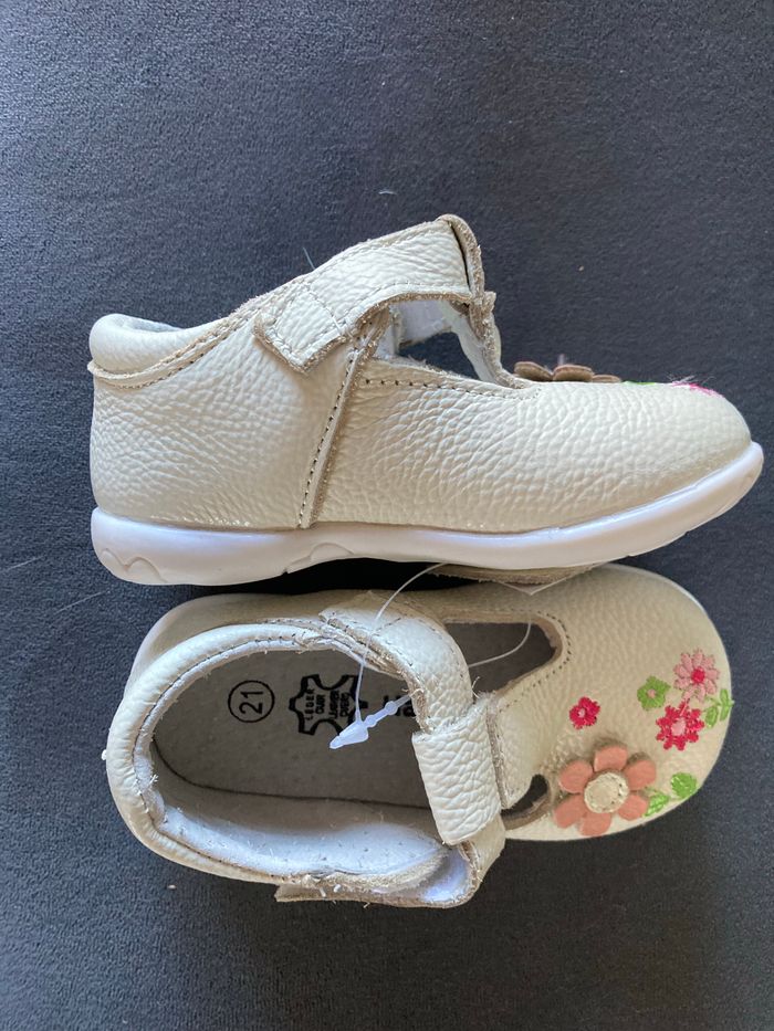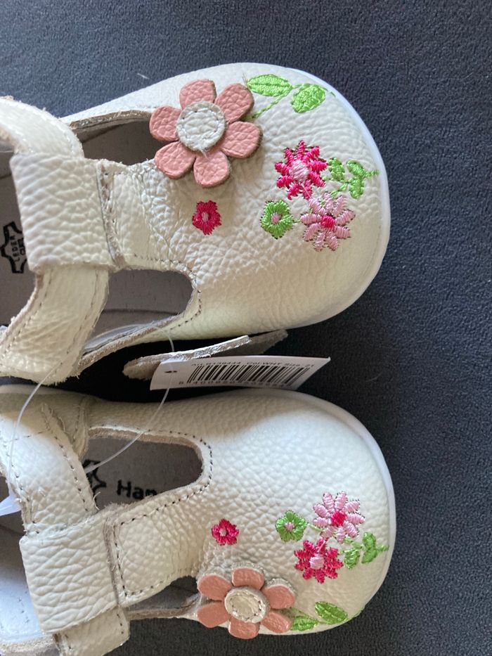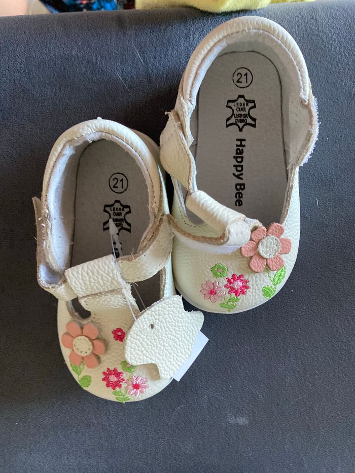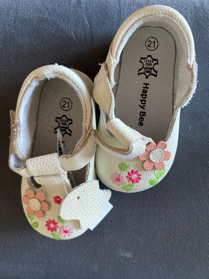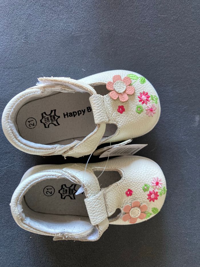 Jamais porté car trop petit Fleur en cuir sur le dessus de la chaussure. Semelles souples. Ideal pour l’inter saison. Marque Happy be