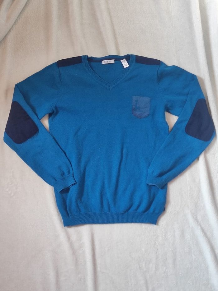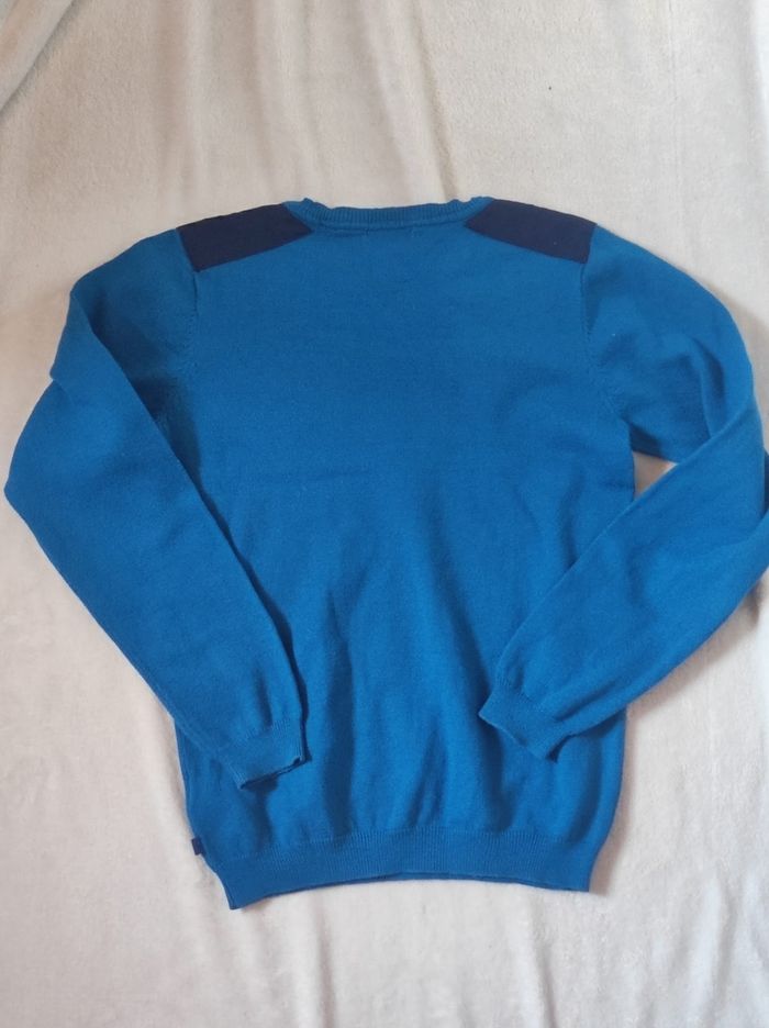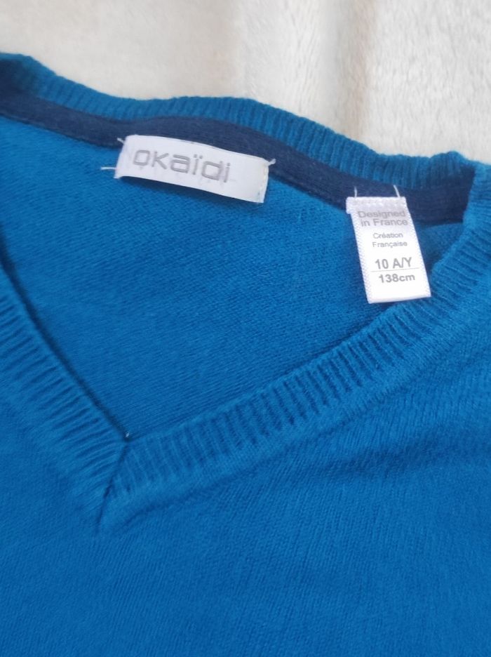 petit pull d'hiver léger à manches longues et col v. En bon état ( bout des manches un peu abîmé, flocage sur la poitrine effacer ). Ni trou ou déchirures. 2 autres dispo dans le dressing. Marque Okaïdi en 10 ans.