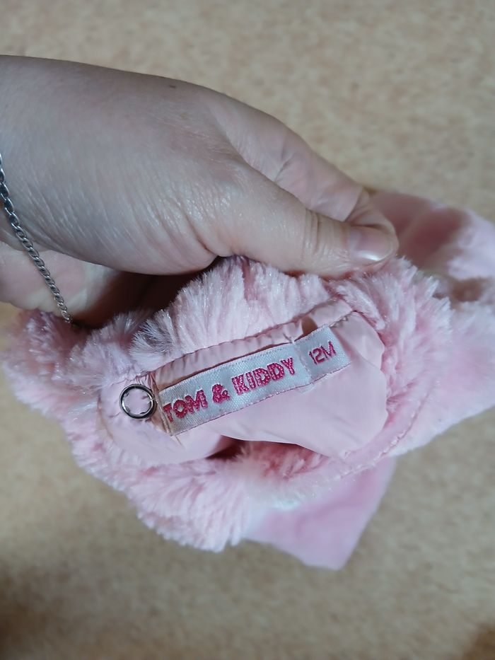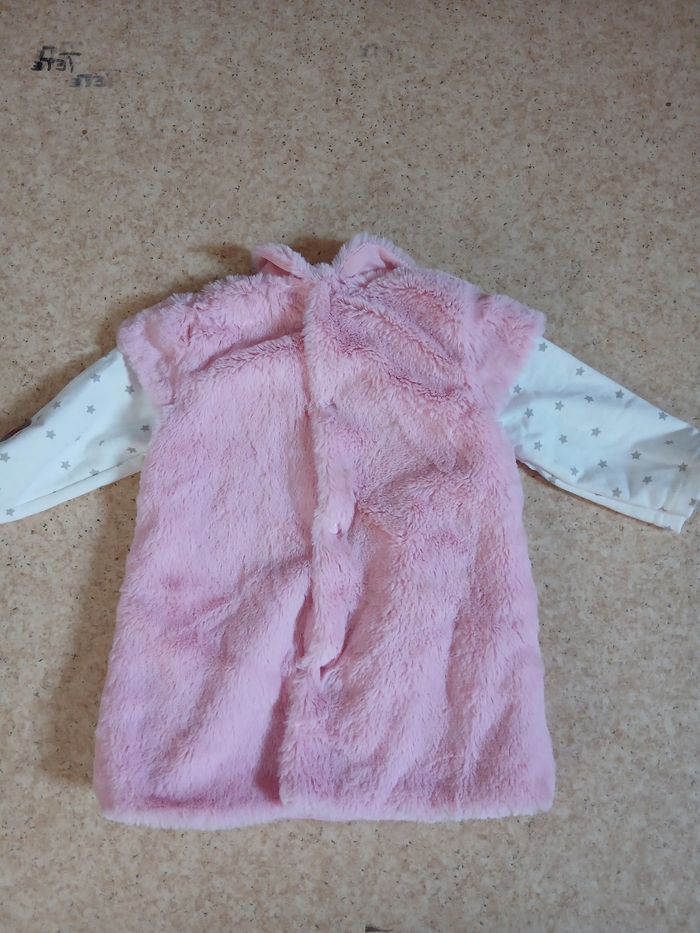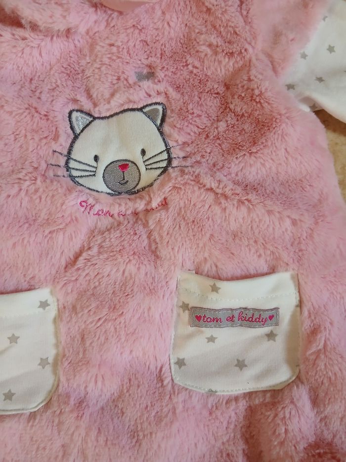 Robe 12 mois Tom et Kiddy. Extérieur rose pilou. Manches longues blanches avec des etoiles. Ouverture-fermeture au dos par pressions. Largeur épaules 21 cm Longueur 32 cm Hiver Irréprochable. Attention étiquettes d'entretien manquante