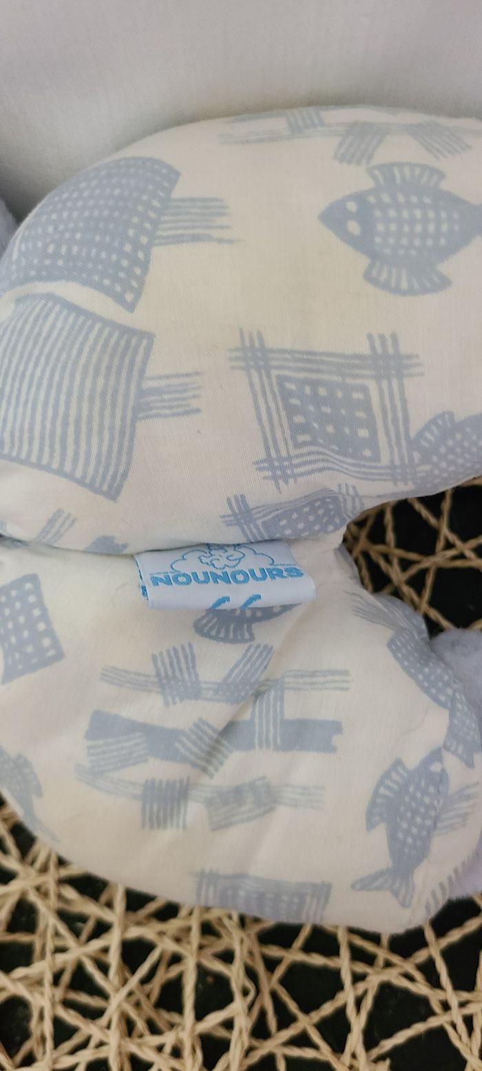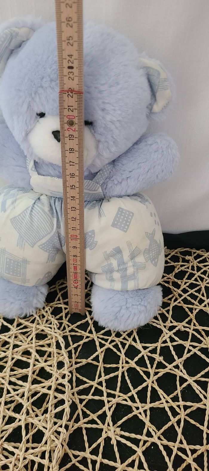 Doudou Peluche Ours Bleu Salopette Blanche Imprimé Poisson Bleu Grelot Nounours - photo numéro 7