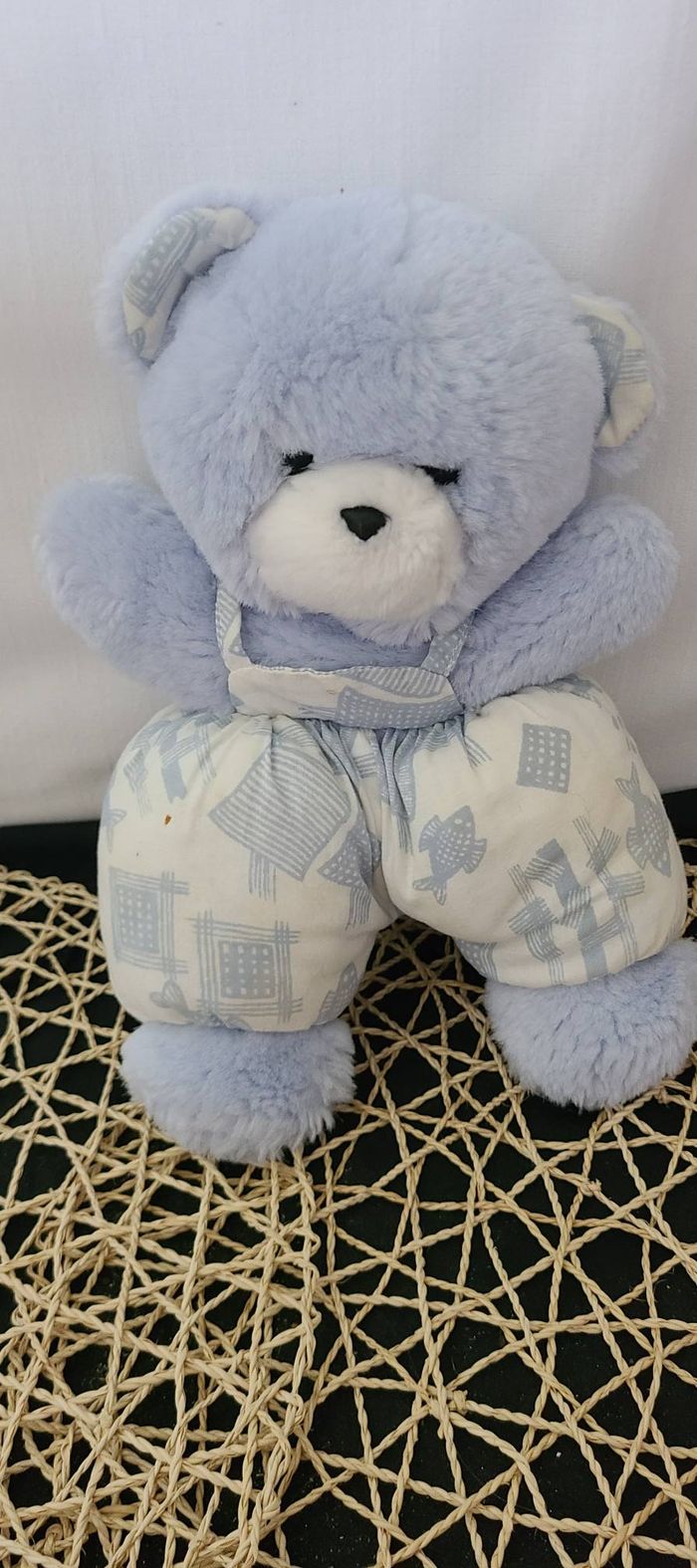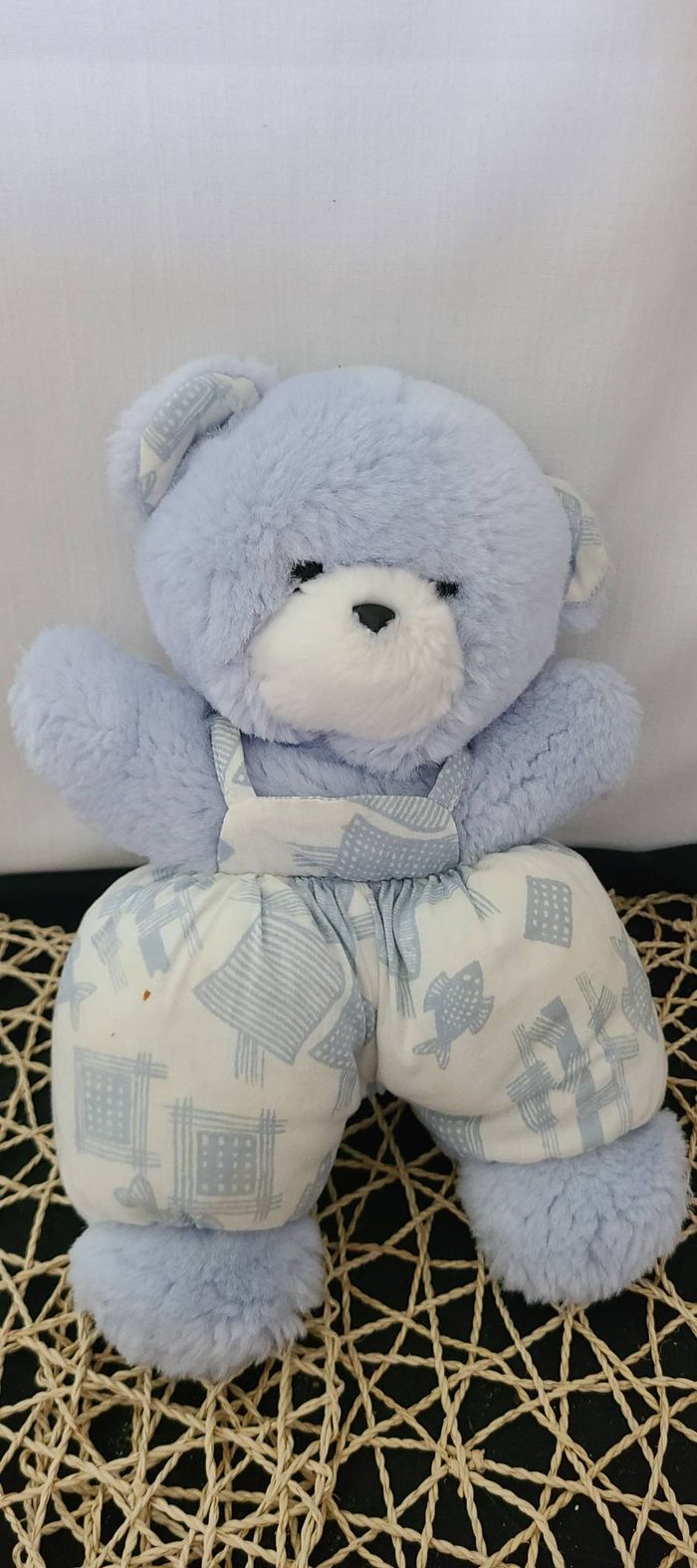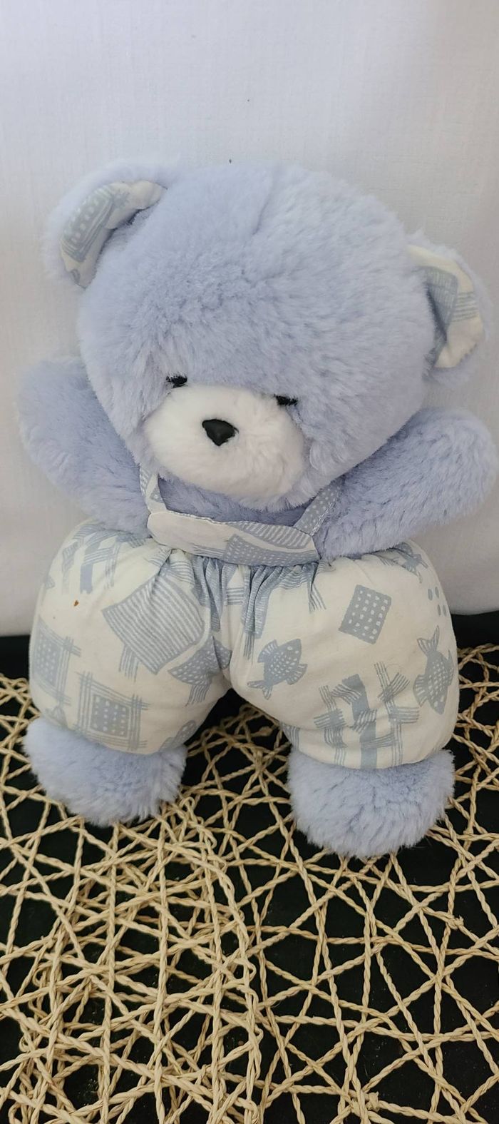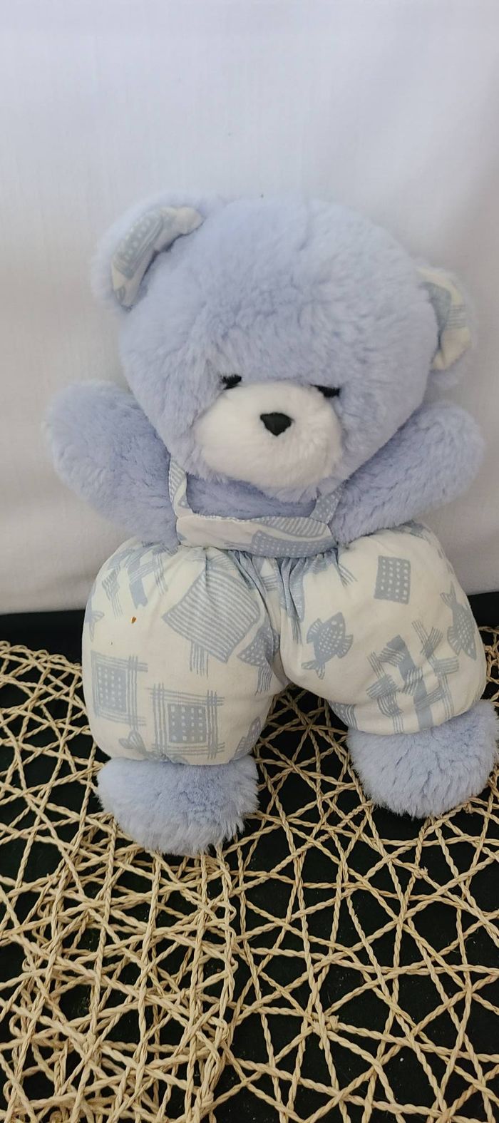 Doudou Peluche Ours Bleu Salopette Blanche Imprimé Poisson Bleu Grelot Nounours - photo numéro 1