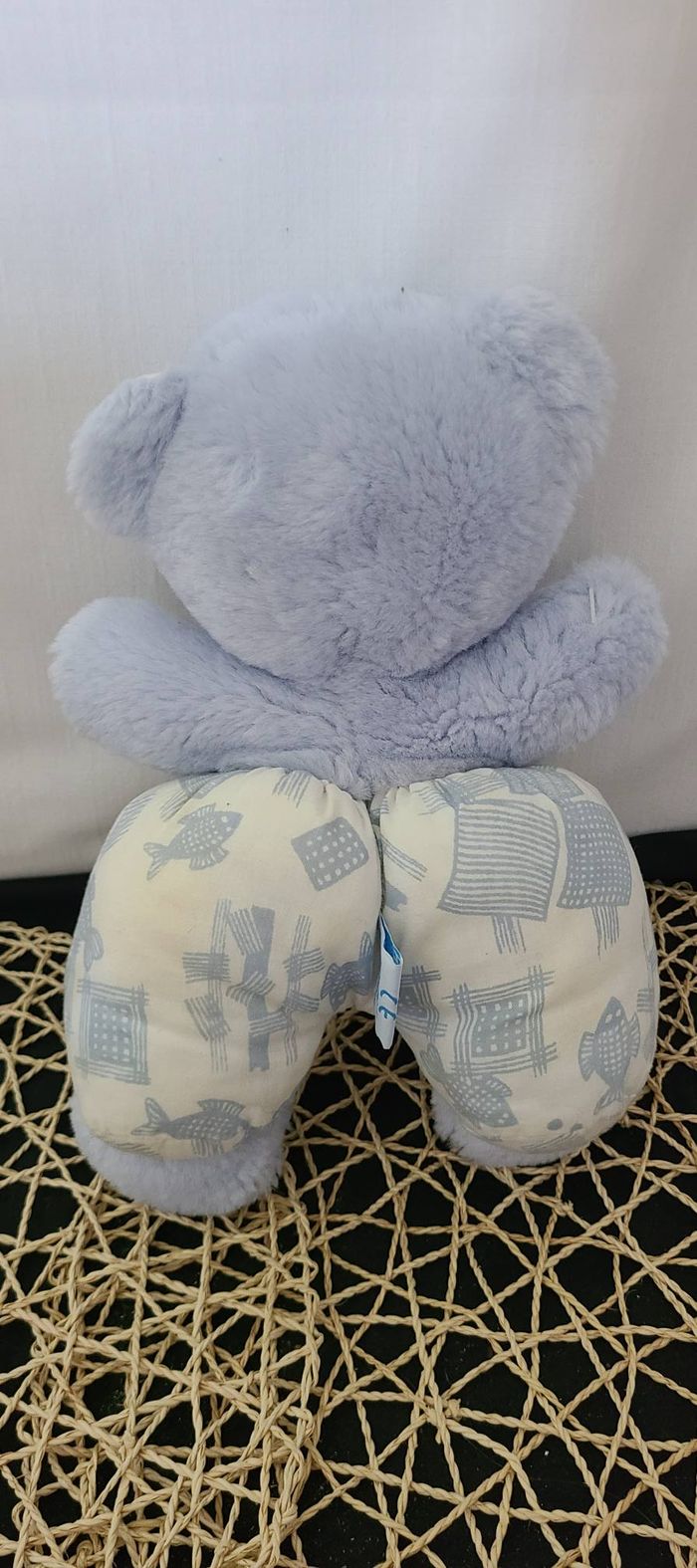 Doudou Peluche Ours Bleu Salopette Blanche Imprimé Poisson Bleu Grelot Nounours - photo numéro 5