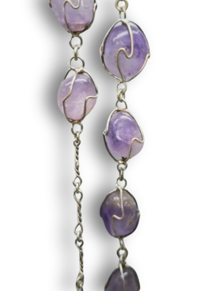 💜 Collier vintage unique, composé de véritables pierres d’améthyste serties à la main dans un fil argenté torsadé. 💜 Chaîne torsadée assortie, style artisanal bohème chic typique des années 70. 💜 Métal testé à l’aimant : non aimanté → probablement argent ou métal argenté de qualité. 📏 Modèle sans fermoir : se porte comme un sautoir ancien, à enfiler directement. 44cm État : très bon, avec une belle patine vintage. 📦 Envoi rapide et soigné.