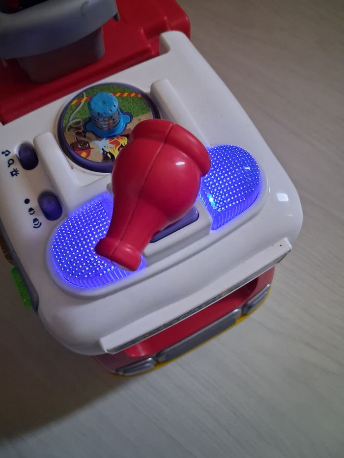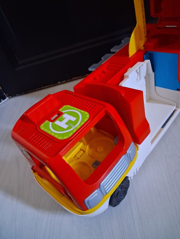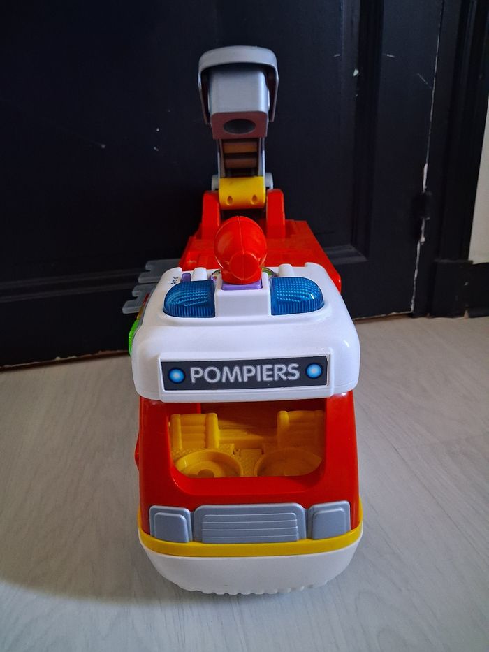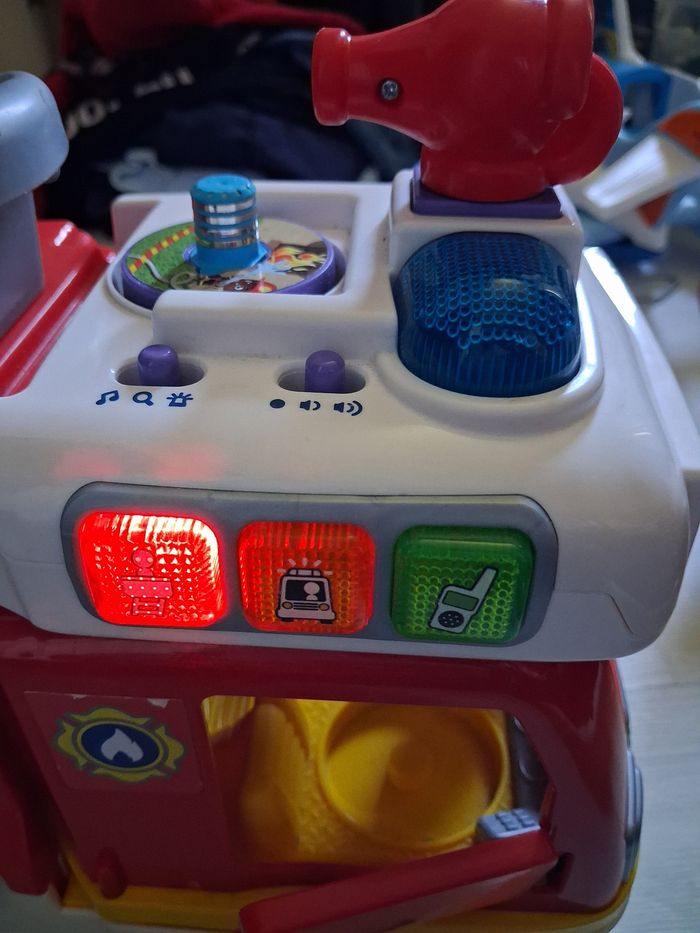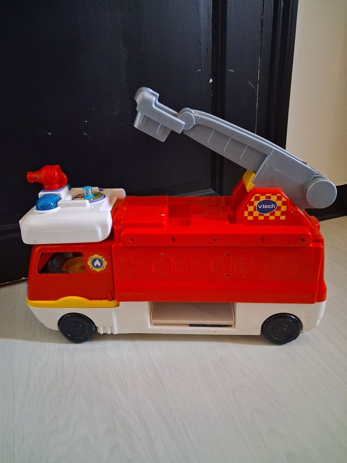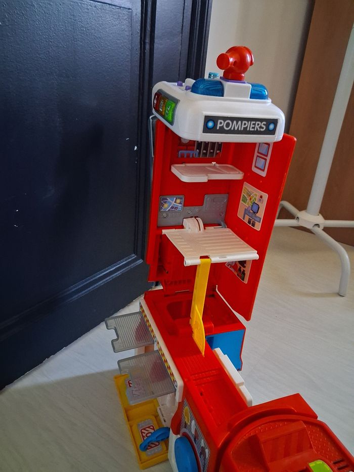 Camion caserne de pompiers interactif Marque VTECH 3 modes de jeux centrés sur la musique , la découverte et les misions des pompiers ( 180 phrases) , lumineux, sonores ( alarme etc. ) La cabine pivote 1 personne Longueur 46 cm environ Hauteur ouvert 55,5 cm environ Fonctionne avec 2 piles R6 ( fournie) Très très bon état