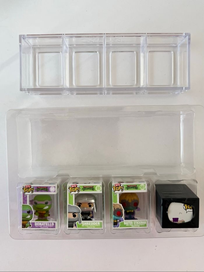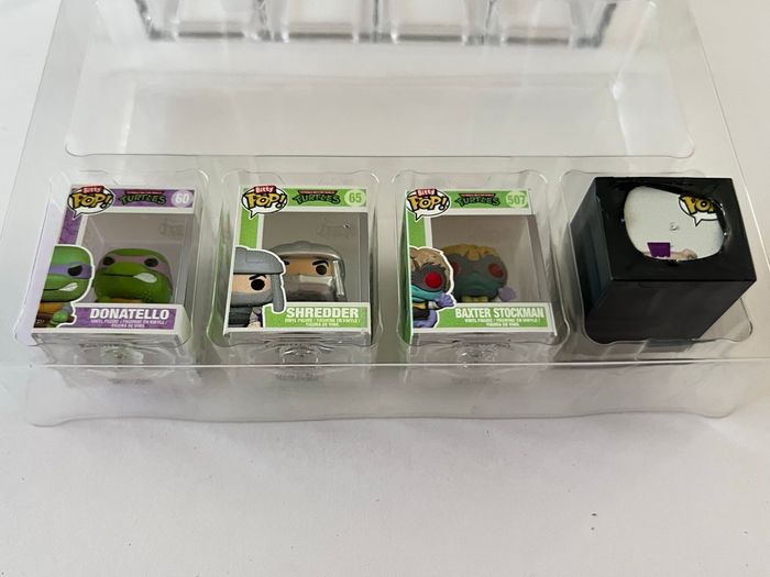 Lot 4 figurines Bitty Pop tortues ninja dont 1 figurine mystère Figurines en vinyle taille 2,5 cm, en emballage boîte-fenêtre. Chaque figurine a son propre mini-présentoir en acrylique rigide. La base du présentoir est détachable et sert de socle à la figurine. Packs jamais exposés, ni déballés. Livraison sous protection bulles/carton.