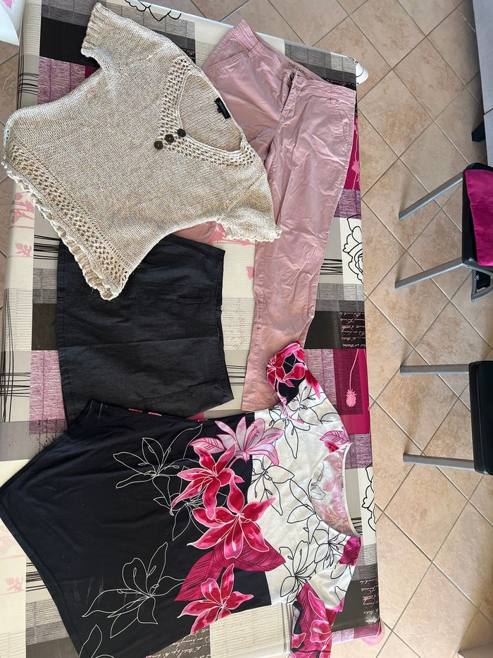 LOT FEMME TAILLE L -1 PANTALON T/L - 1 T.SHIRT T/L - 1 JUPE T/42 - 1 PULL MANCHE COURTE T/L