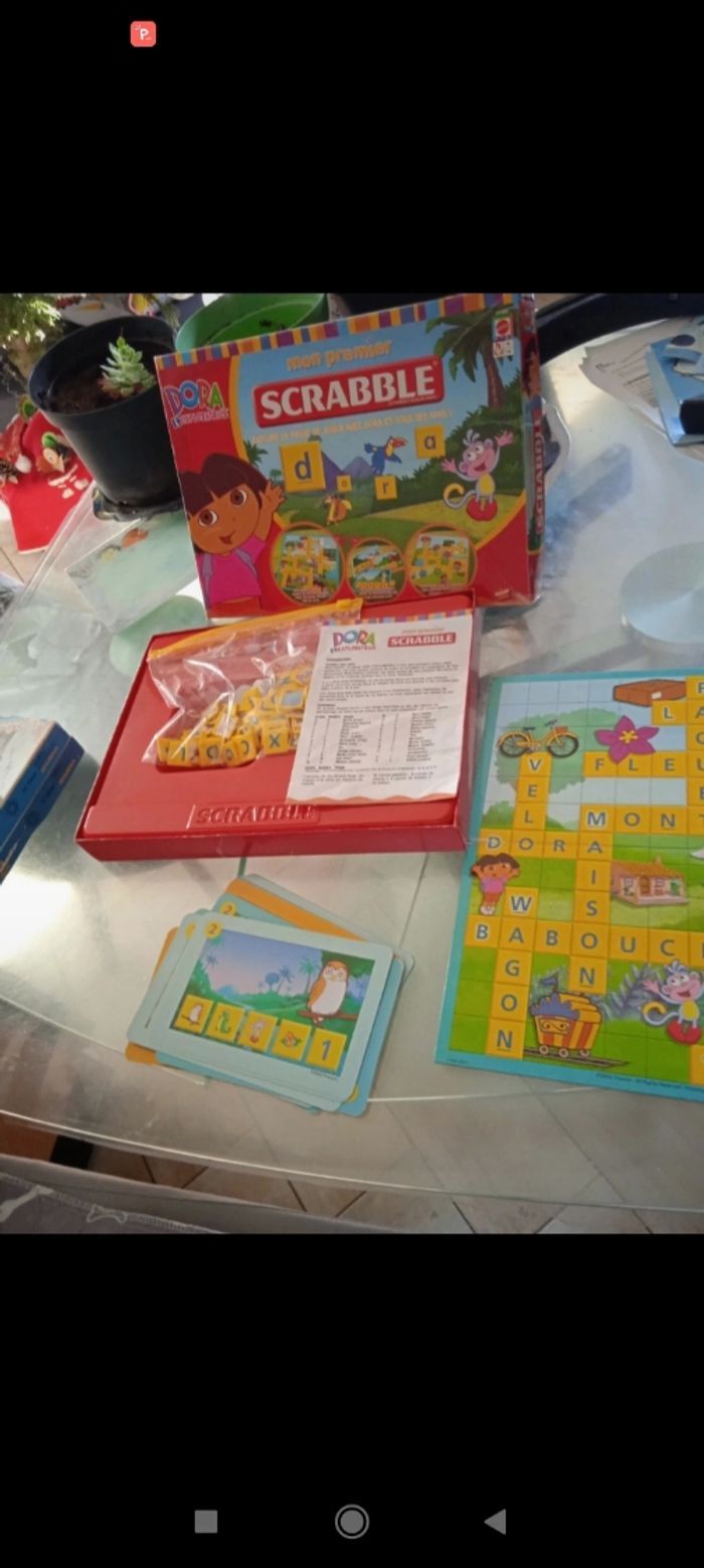 Mon premier scrabble avec Dora Pour apprendre des mots simples en français et anglais Apprendre a reconnaître les lettres Plateau et carte réversible (un côté français et un en anglais) Boîte abimé, jeu en bon état et complet #jeudesociete #scrabblejunior