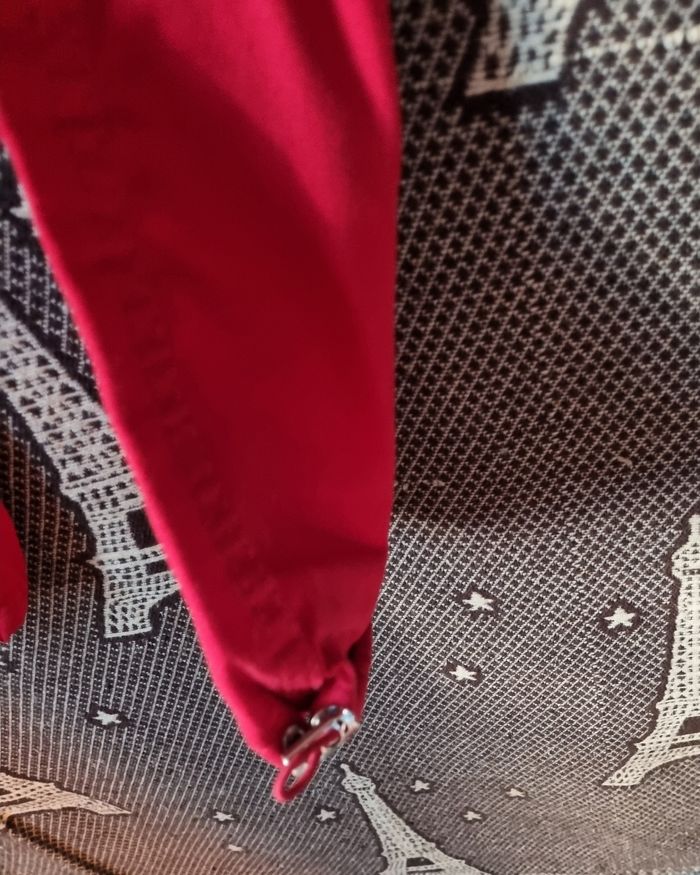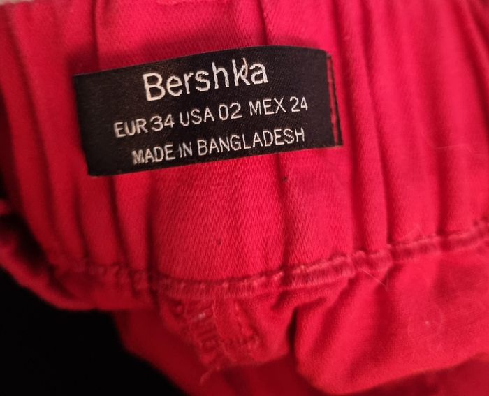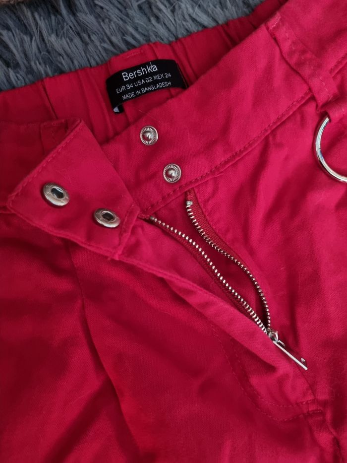 Pantalon rouge style cargo, taille 34 marque Bershka, fermeture zippée avec pressions ,élastique aux chevilles et à la taille, longueur 92cm, largeur de la taille 34cm, largeur cuisse 25cm, largeur cheville 14cm.