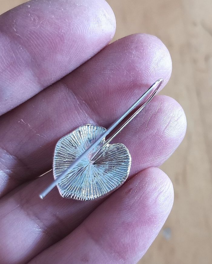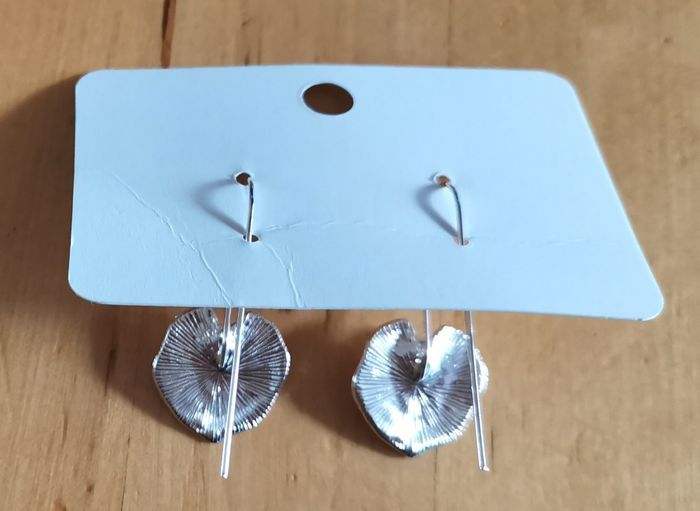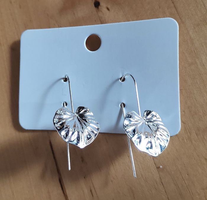 Boucles d'oreille fantaisie "La boîte à trésors",, feuilles couleur argent à longues tiges, pour oreilles percées, neuves.