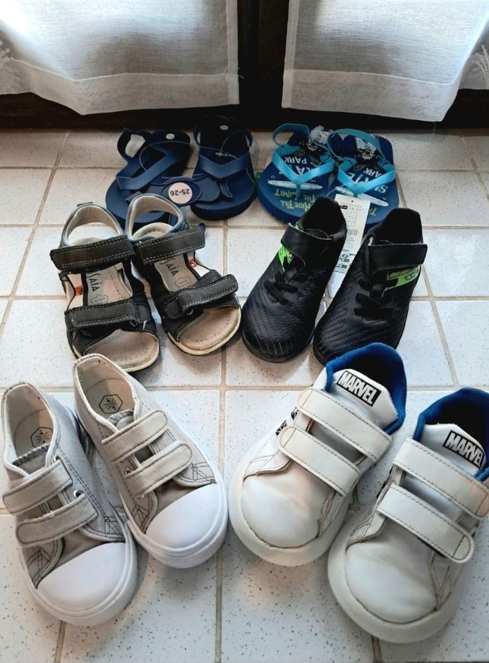 2 paires de tons neuves avec etiquette 25 1 paire de chaussure gemo grise neuve 25 1 paire de crampon kipsta tbe porté 2 ou 3x 1h sur gazon synthetique 1 paire de chaussures adidas marvel tbe 1 paire de sandale tissaia tbe Maison non fumeur, premiere main, pas d'animaux D'autres vetements sur #lau57babyboy24mois (Je n'ai pas encore eu le tps de mettre les pantalons, me demander si interesse)