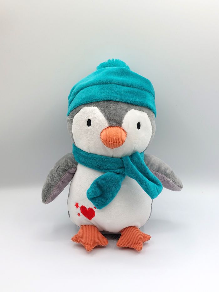 Peluche doudou pingouin blanc bleu vert Françoise SAGET nez orange cœur étoiles