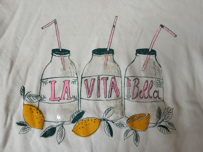 T-shirt blanc a manches courtes avec dessins de verres de cocktail marqué "La Vita è bella". Petits sequins transparents dans les verres. Marque Tape a l'Oeil Taille 12 ans / 152 cm Très bon état
