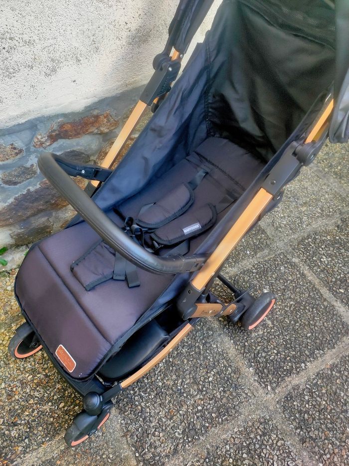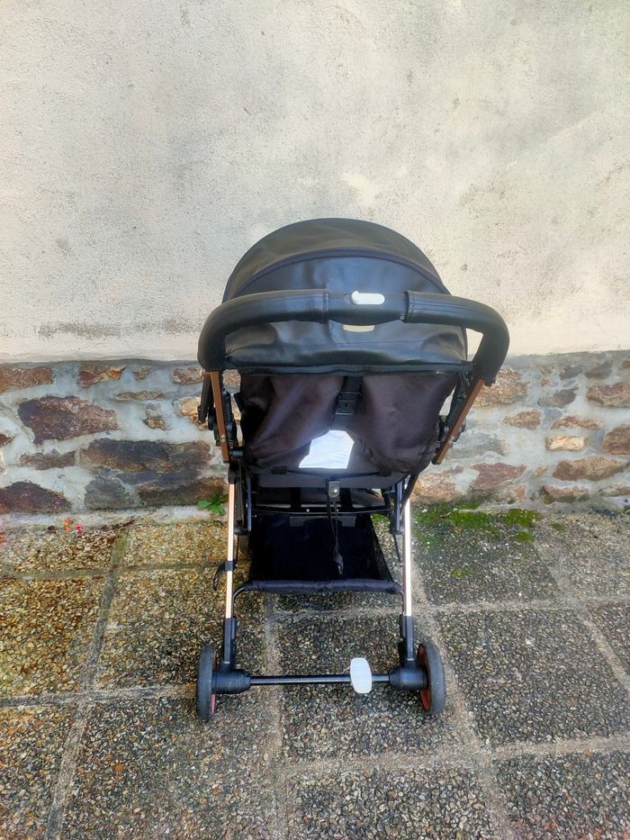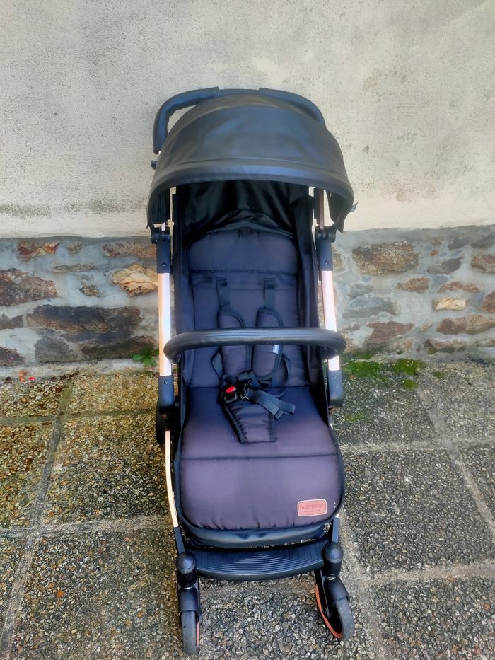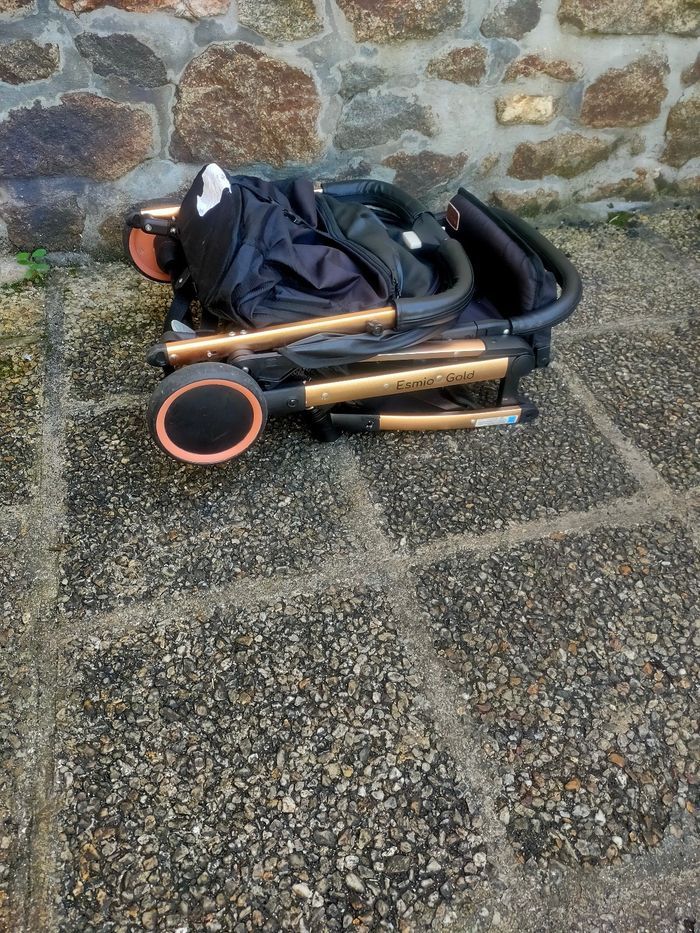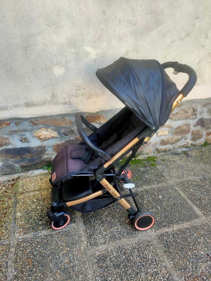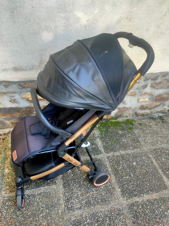 Poussette compacte BABYDOES ESMIO GOLD Travel Lite . Chassis en aluminium coloris cuivré et finition de la capote en similicuir noir. Son assise large et son dossier inclinable multi-positions offrent un espace douillet où votre tout-petit peut s'asseoir ou dormir. La capote réglable le protège des intempéries, tandis qu'une fenêtre de toit transparente vous permet de surveiller ses moindres mouvements. Le pliage est simple et peut ce faire avec une seul main (après avoir pris le coups de main). Elle est très compacte et surtout légère (7,5kg). Elle possède une poignée télescopique et un sac de transport. Idéal pour les voyages en train et/ou avion. Elle est en très bon état, a servit très occasionnellement pour un enfant. Groupe d'âge : 0/24 mois mais recommander a partir ou l'enfant tiens assis donc a partir de 6 mois jusqu'à 20kg Max Poids de la poussette : 7,5kg Prix ferme, PAS DE NÉGO !!!