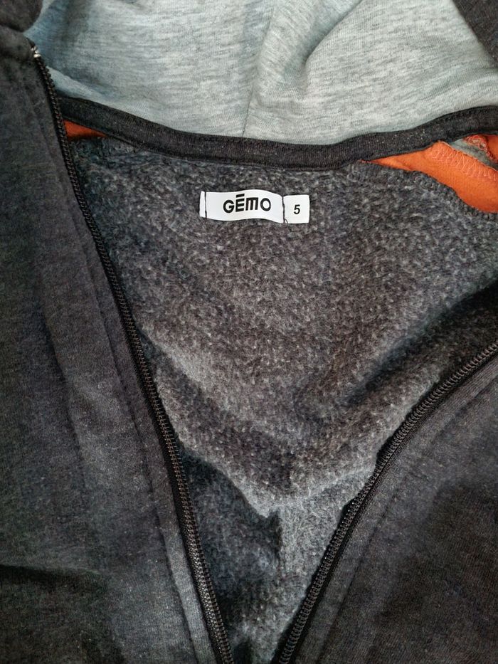 Gilet zippé gris à capuche, taille 5ans marque Gémo, 2 poches, intérieur molletonnée, (la tirette est légèrement abîmé car c'est retrouvé coincé dans le tambour de la machine à laver 😅) mais sinon la veste est en très bonne état 👌🏼.