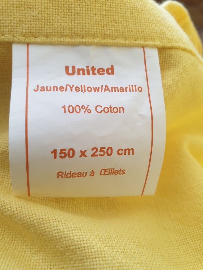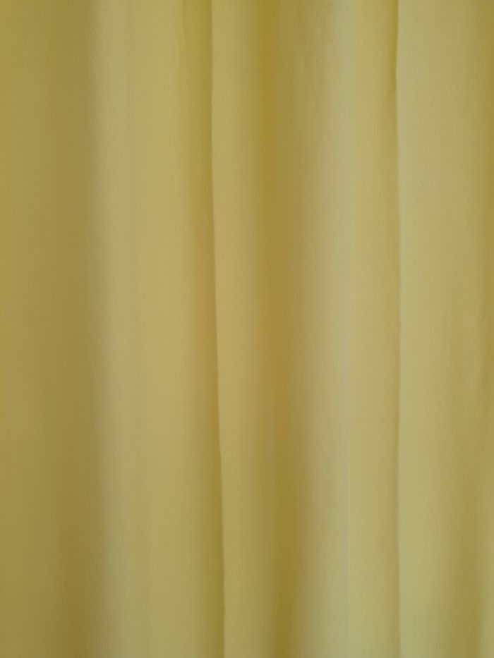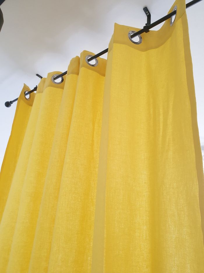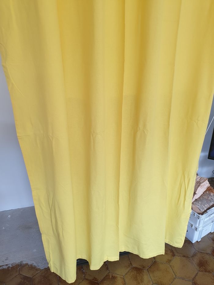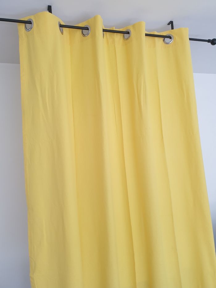 Rideau jaune avec oeillets. Il mesure environ 150cm de large et 250cm de long. Il a quelques traces d'utilisation. Très lumineux.
