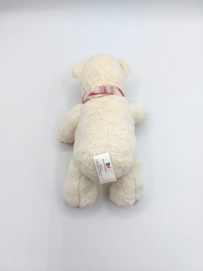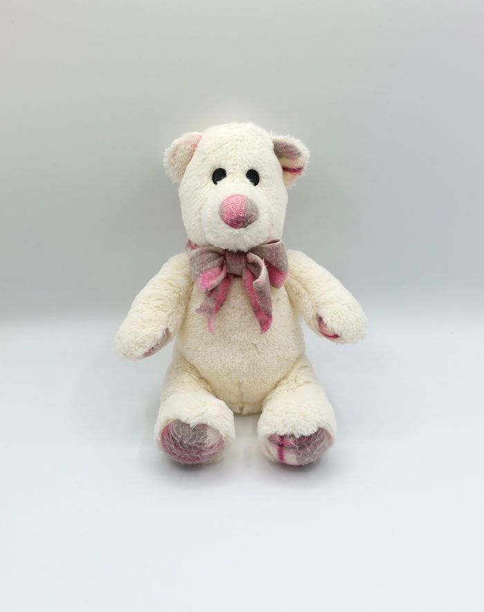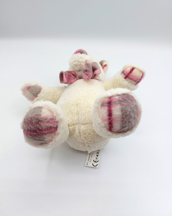 Peluche doudou ours blanc Primatis B coeur écharpe polaire rose carreaux 24 cm