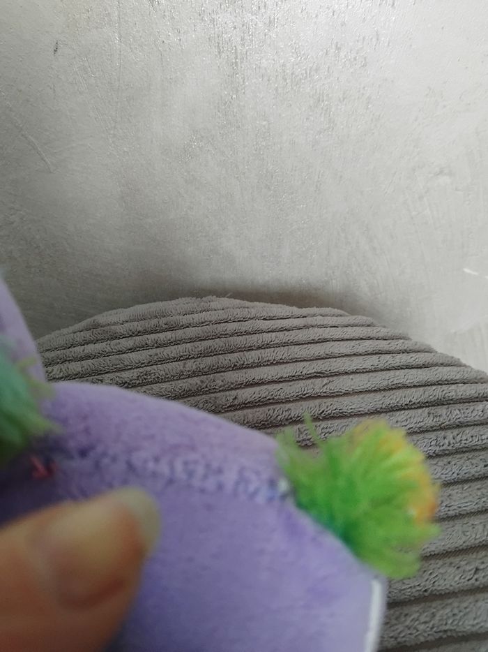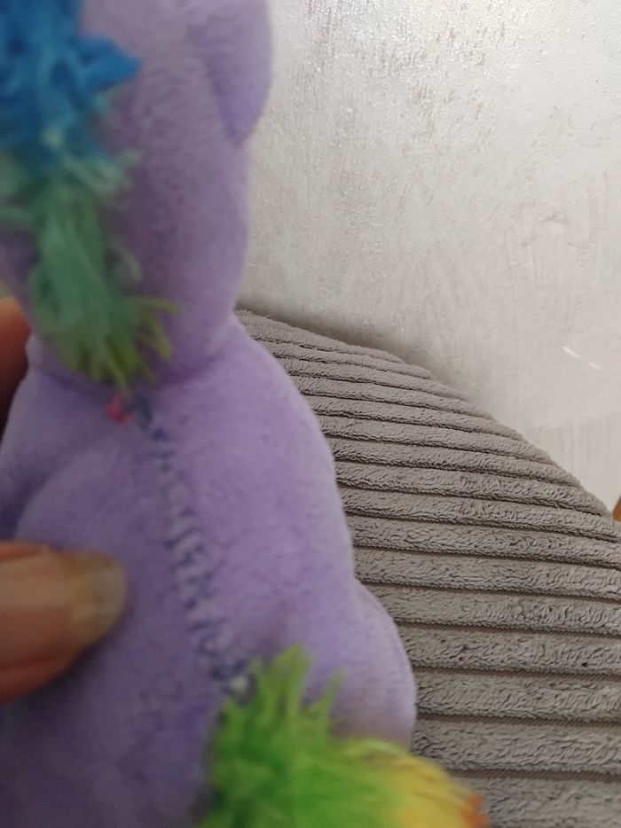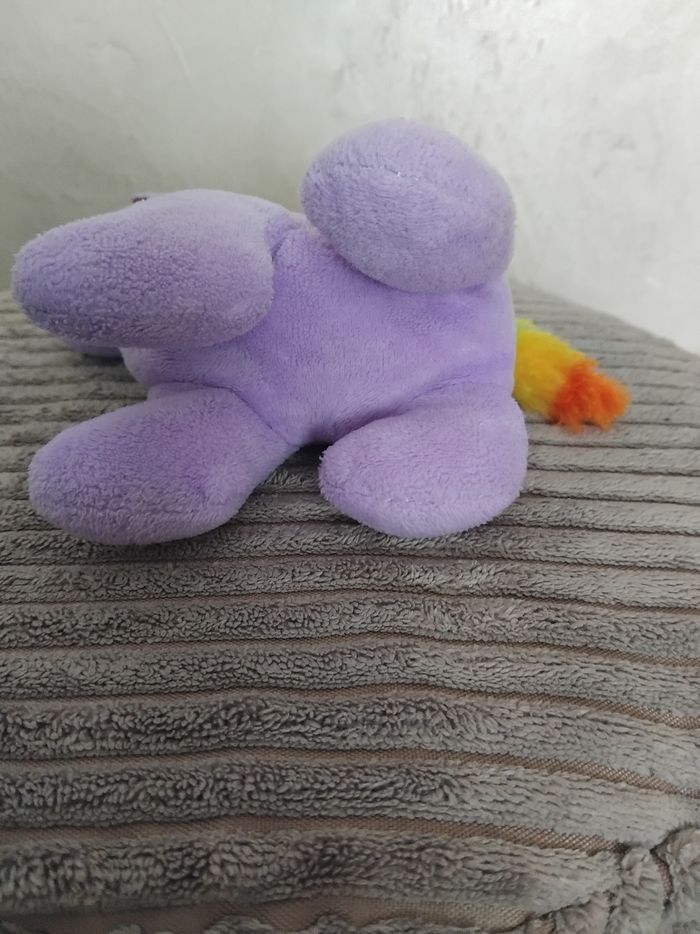 Peluche de 13 cm environ et de couleur violette. Possède une petite accroche pour accrocher la peluche. Présente un défaut: point de couture sur le dos de la peluche (voir photo). Peluche propre (laver en machine). #peluchenade3033 #joueteducatifnade3033 #jouetenfantnade3033 #bazarnade3033