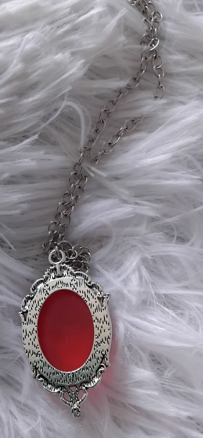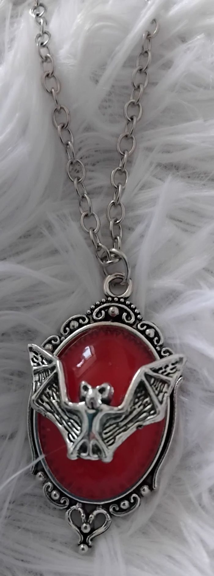 Collier style bohème de couleur argenté Pendentif médaillon rouge sang avec chauve souris de couleur argenté sur le médaillon Longueur de la chaîne : 45cm + 5 cm Médaillon : 4 cm sur 2 cm Acier inoxydable