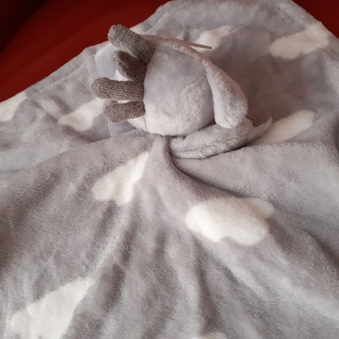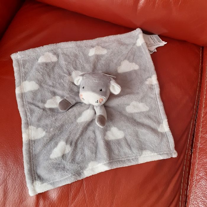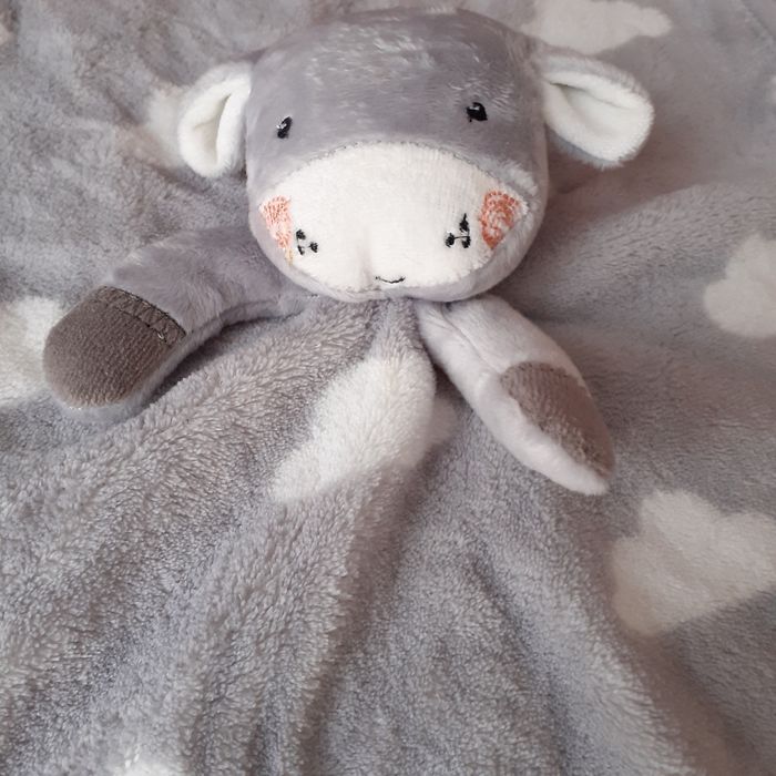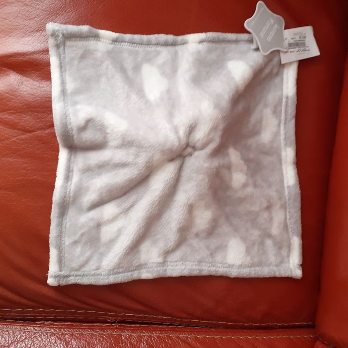 Article Neuf, encore étiqueté; marque Luvena. Tête et pattes rembourrées; yeux et museau brodés; mouchoir gris et blanc. Attache plastique tjrs en place. Format du mouchoir de 32 cm X 32 cm // voir photos pour détails