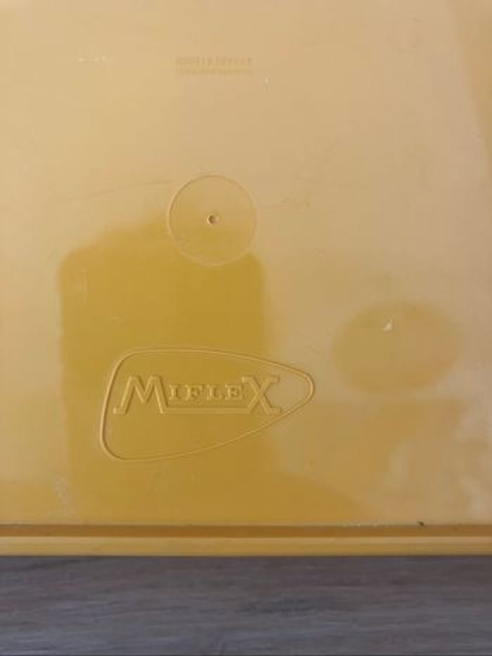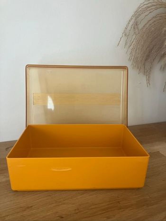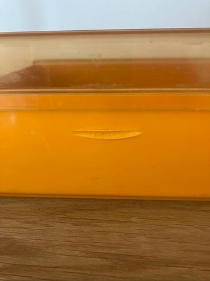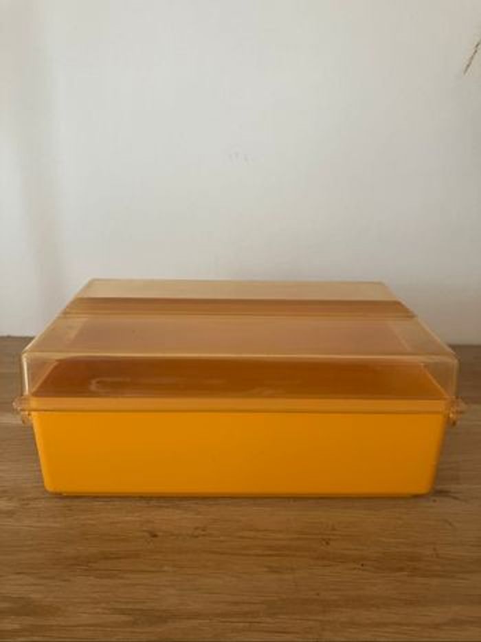Cette boîte à sucre est vintage : elle date des années 70. Marque Miflex, modèle déposé Elle est parfaitement fonctionnelle mais porte les traces du temps : 2 marques sur le devant (certainement des brûlures (voir photos) et la partie transparent du couvercle , l’est un peu moins (transparente) à certains endroits (voir photo) Dimensions : - hauteur : 8 cm - largeur : 18,5 cm - profondeur : 12 cm