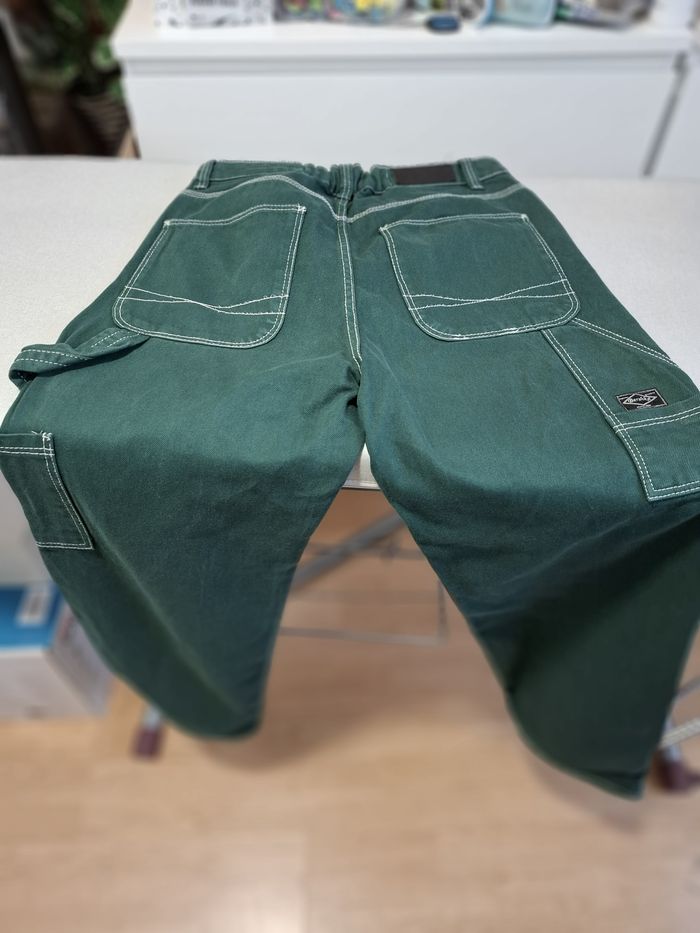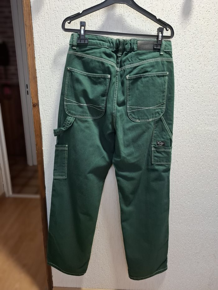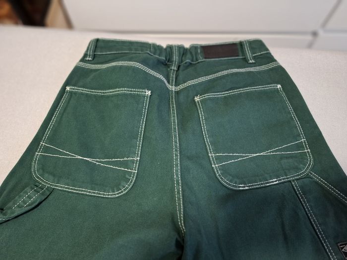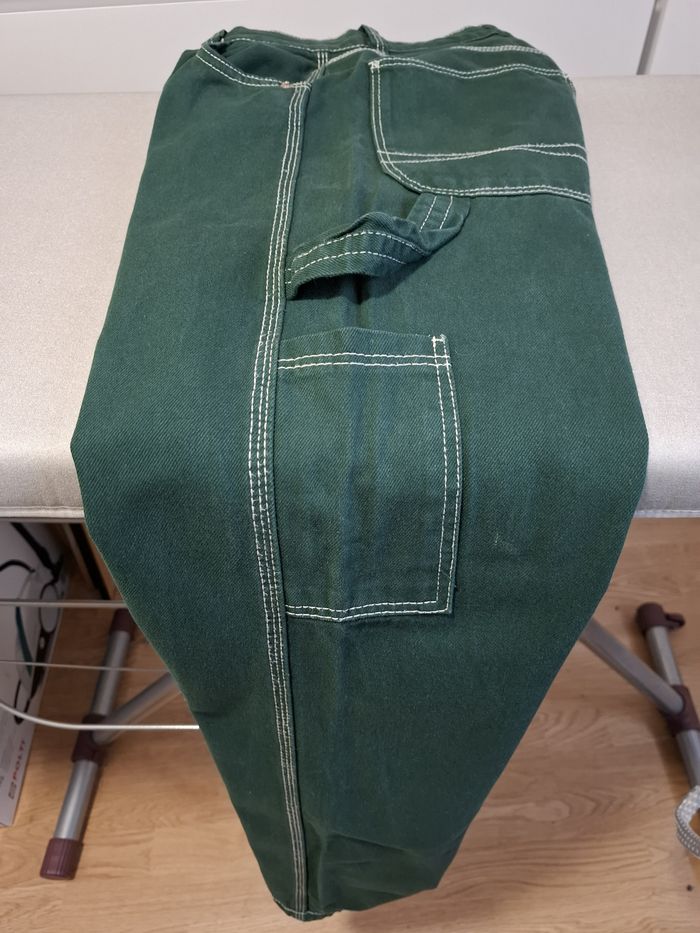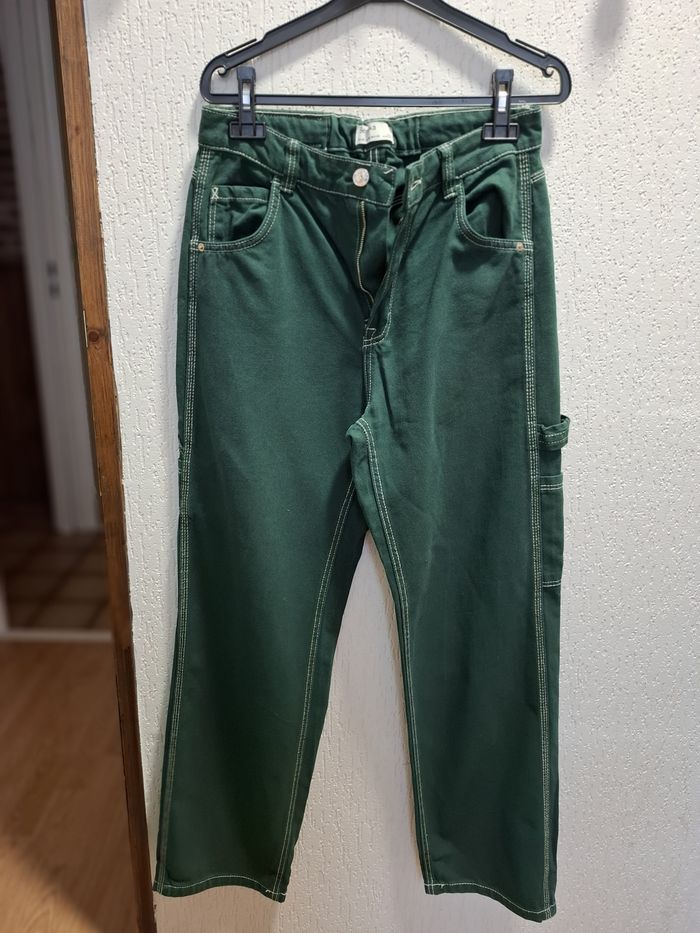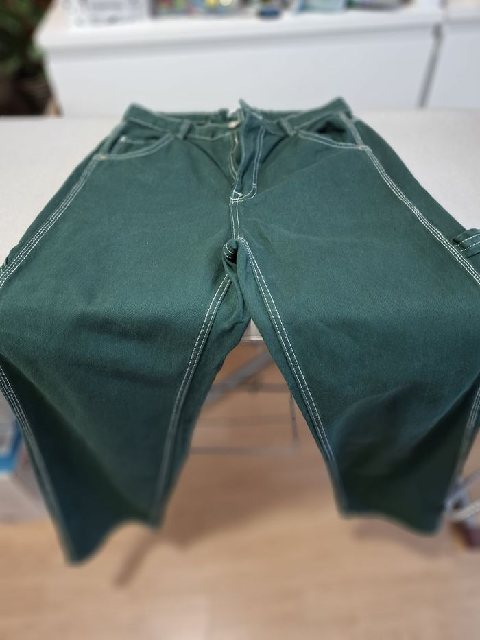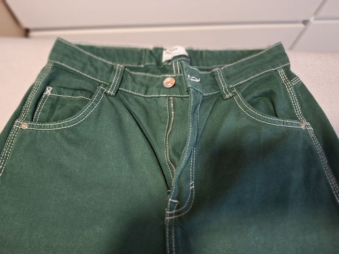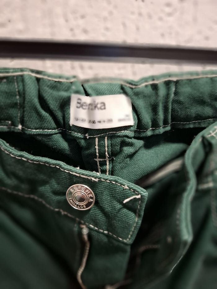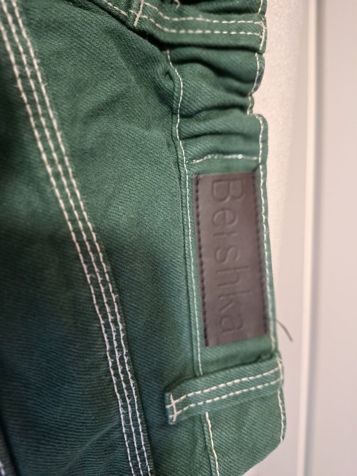 Beau jean baggy pour femme, marque BERSHKA, en taille 38, couleur vert sapin, fermeture bouton métal + zip, coupe 5 poches, poche cuisse côté gauche, 2 poches cuisse arrière droite avec écusson de la marque, surpiqûres blanches sur tout le jean, écusson simili cuir à la taille (arrière), taille légèrement élastiquée à l'arrière, bas droits, en 100 % coton, lavable en machine à 30° et en excellent état (très peu porté).