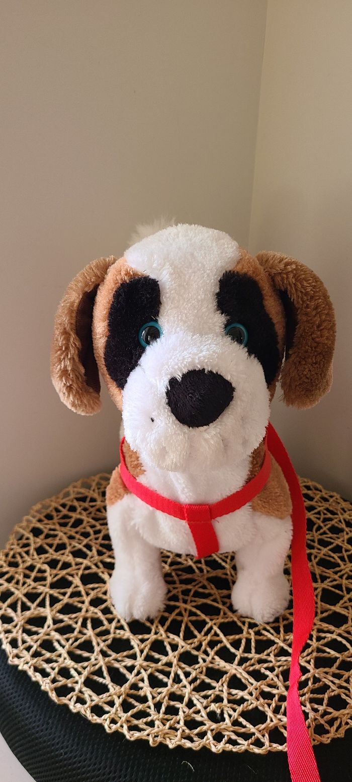 Billy est un adorable Saint-Bernard qui adore les promenades ! Mets-lui son harnais avec sa laisse et grâce à un capteur, il va reconnaître qu'il est l'heure d'aller se promener ! Il est très réaliste : il marche, il aboie, s'assoit, bouge la tête et la queue ! Tape des mains et il avance en marchant vers toi en aboyant joyeusement ! Caresse-lui la tête et Billy s'assoira en bougeant la queue ! Billy va devenir ton meilleur ami !